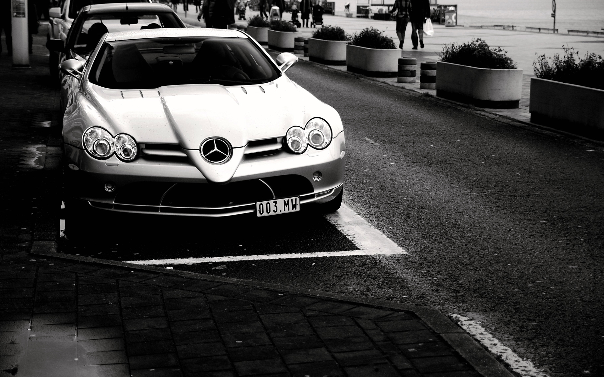 Description: A white car parked in a parking space next to a sidewalk with people walking on the sidewalk and a person walking on the sidewalk.