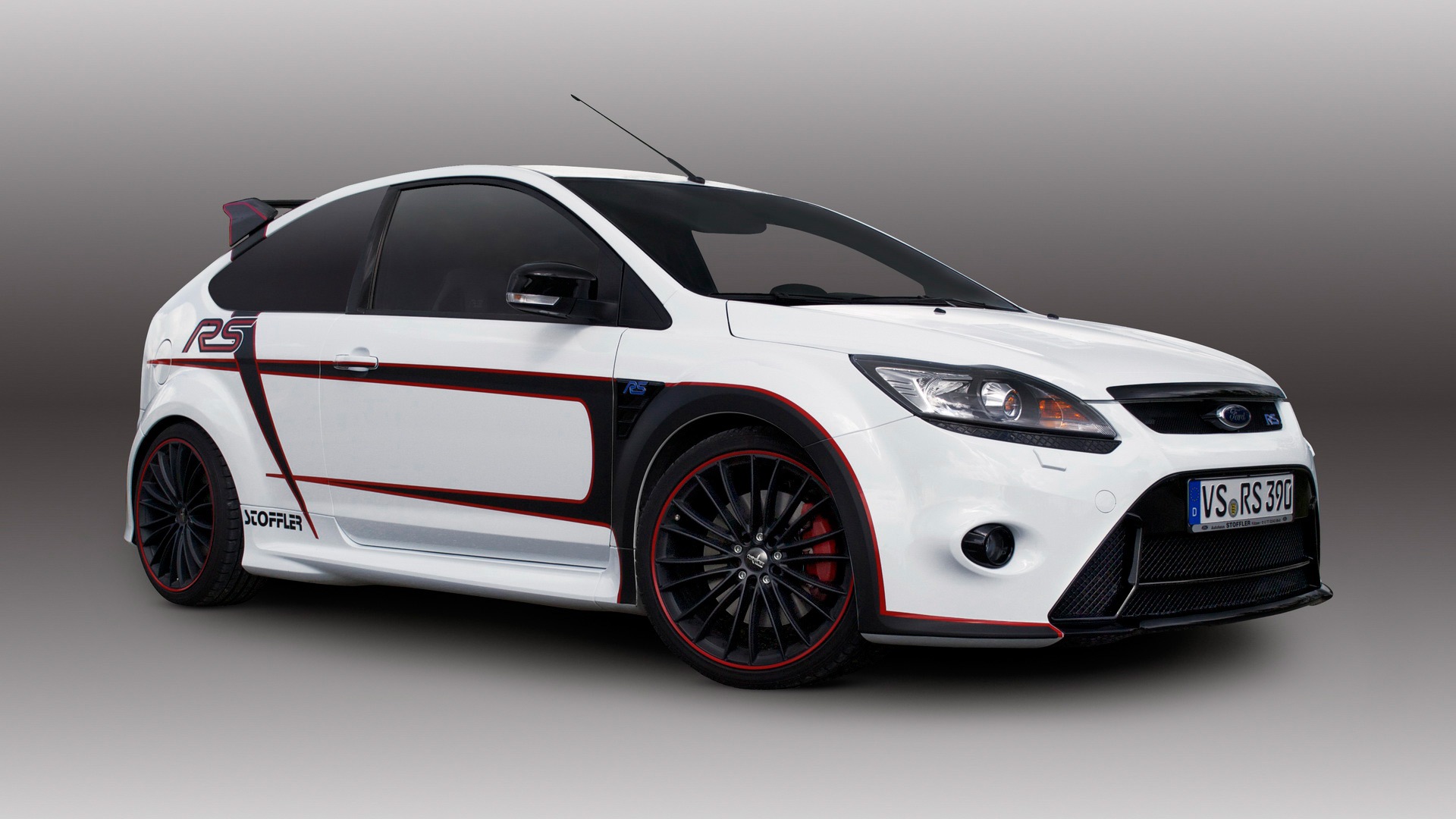 Description: A white car with red trim and a black hood and tail lights and a black tire rim and a white background.