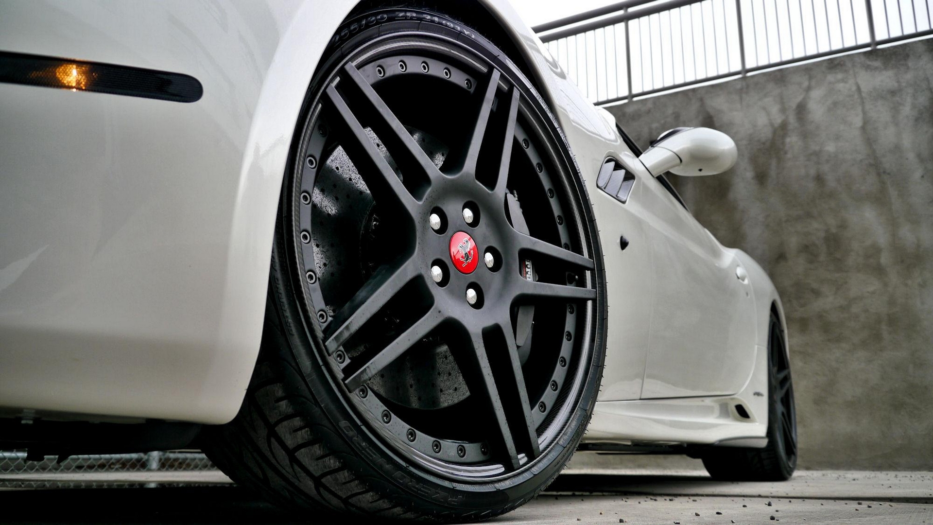 Description: A white car with a red brake light on it's side wheel rims and a black brake pad.
