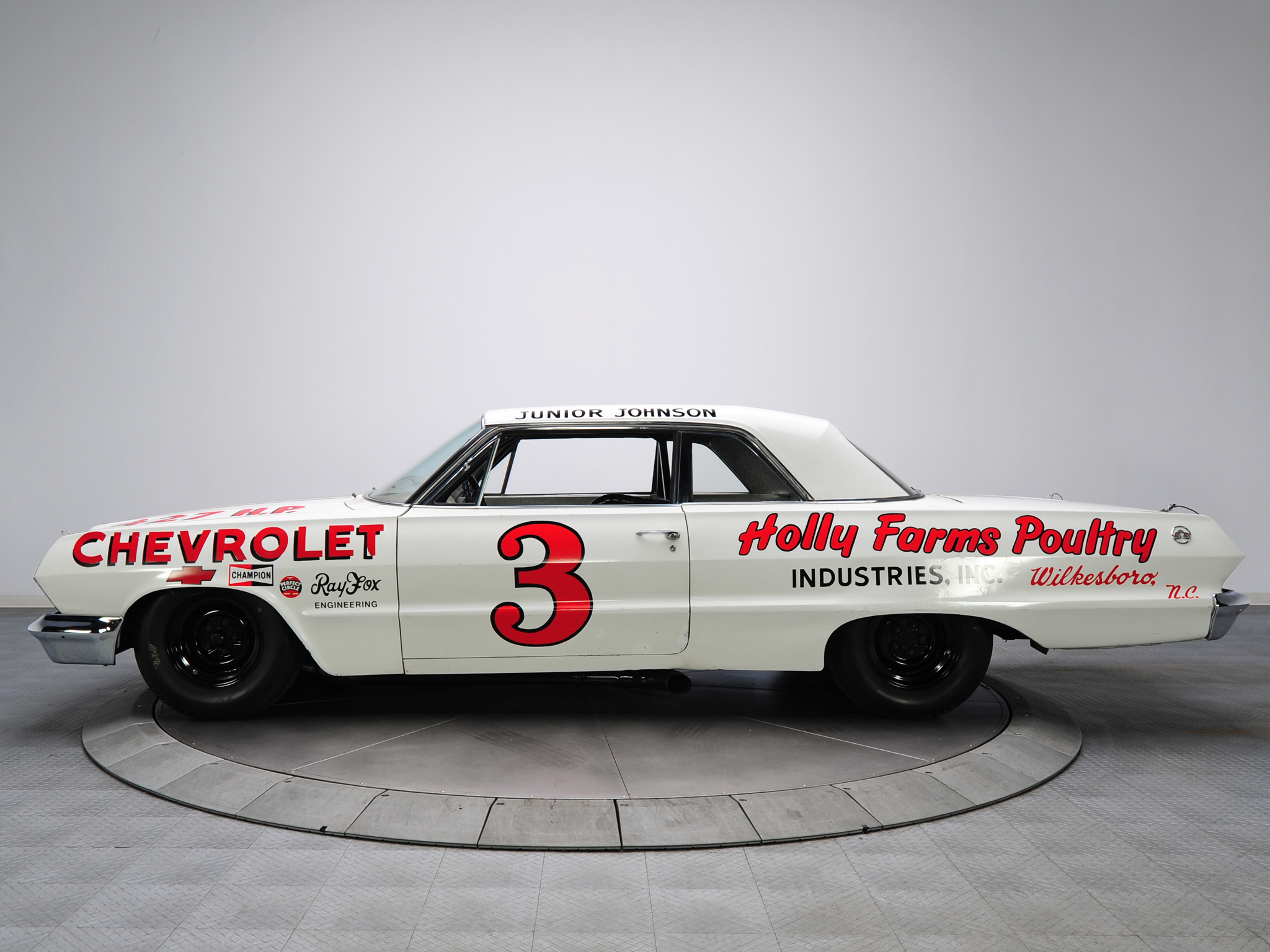 Description: A white car with a red number on the side of it's body and a name on the side of the car.