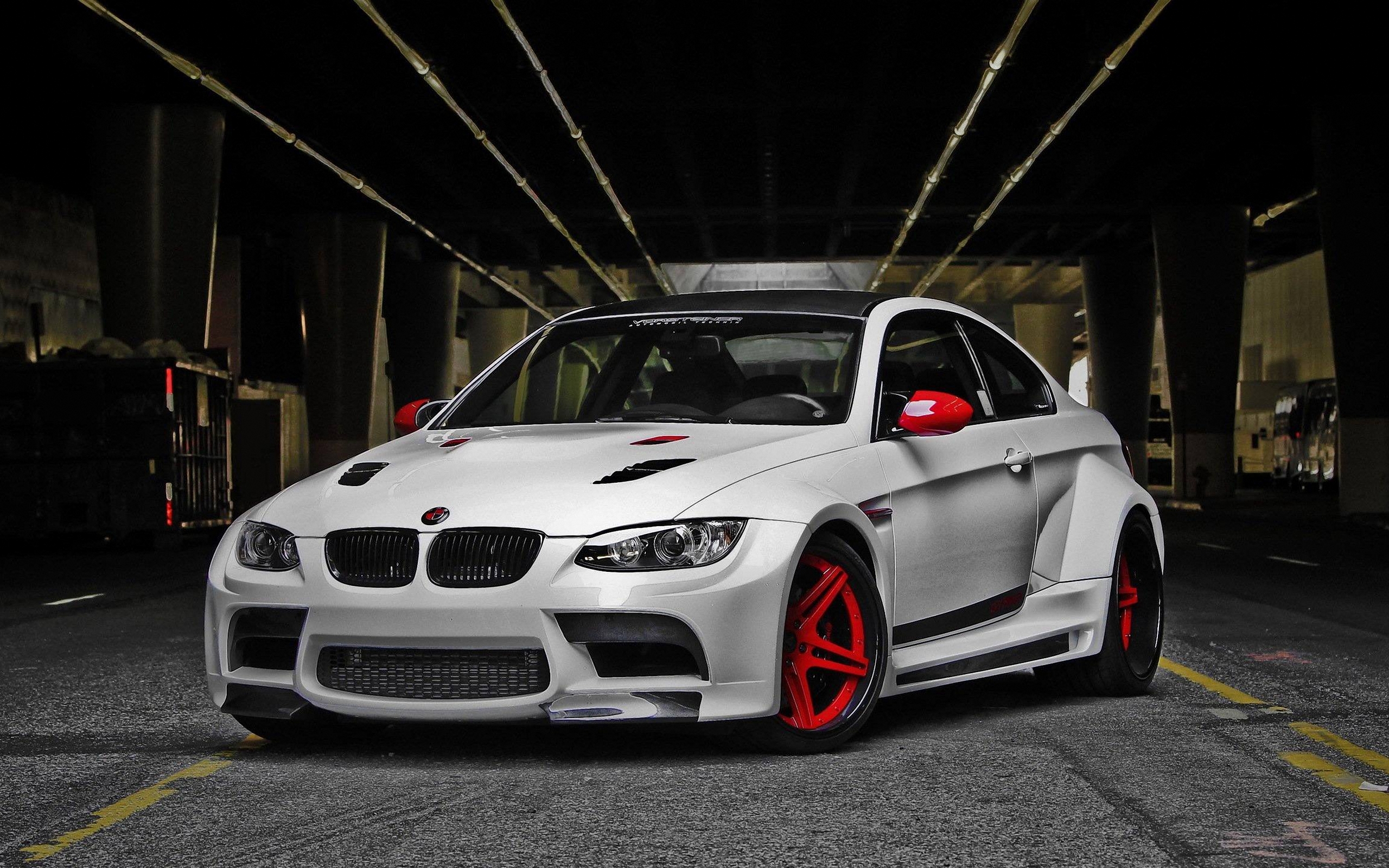 Description: A white car with red rims parked in a tunnel with a red light on it's side.
