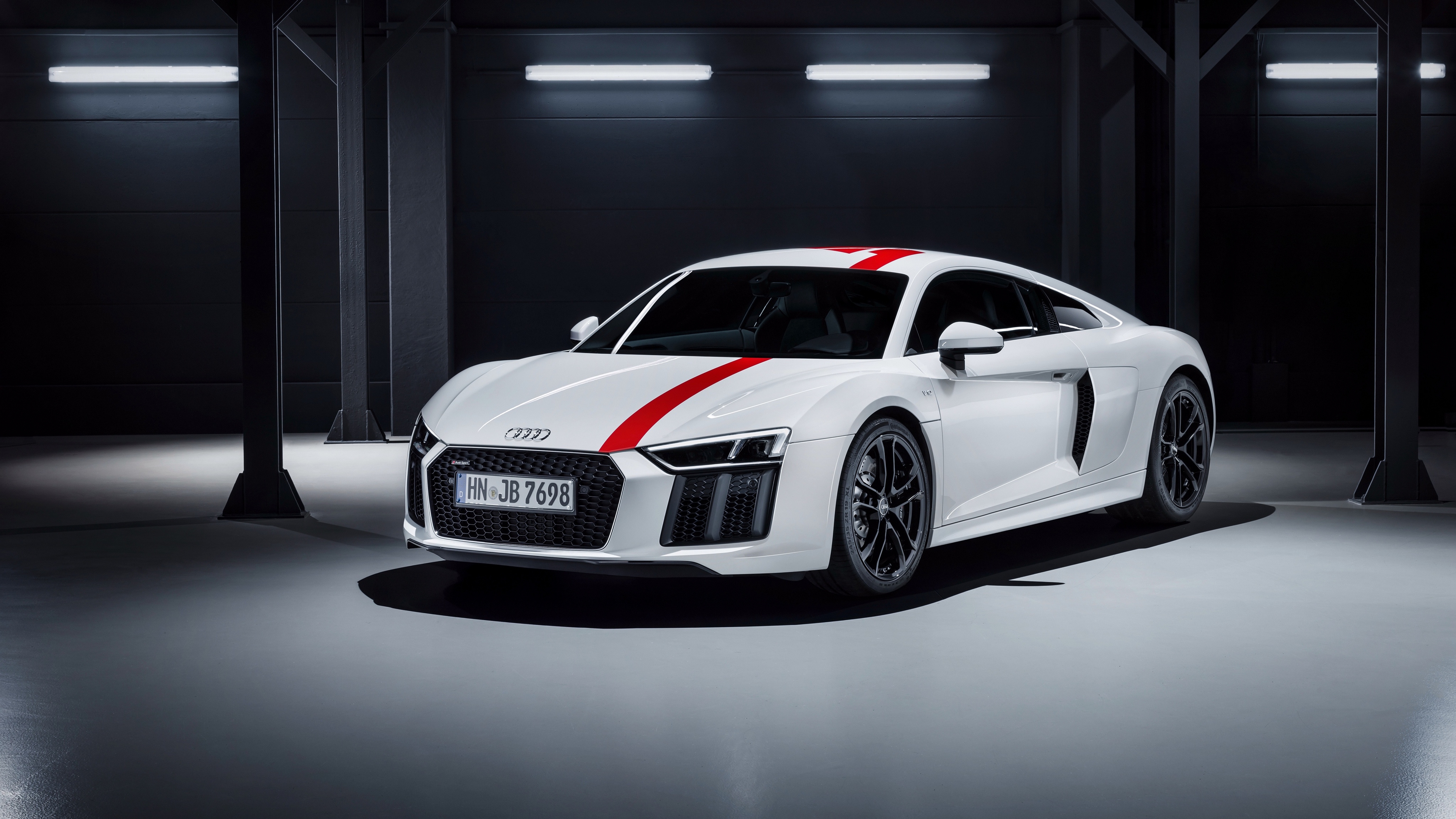 Description: A white car with a red stripe on it's side in a dark room with lights on the floor.