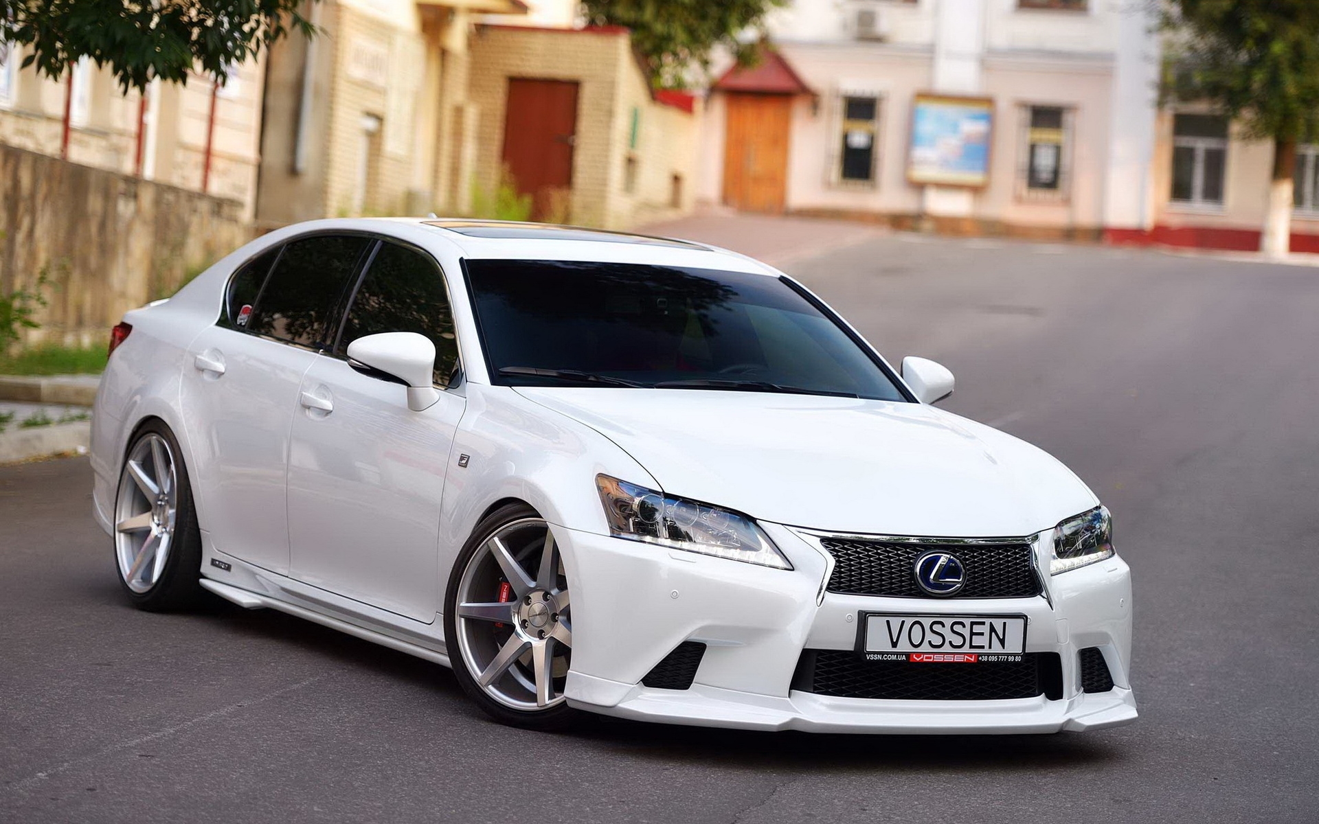 Description: A white car parked on the side of a road next to a tree and buildings in the background with a sign that says vosen.