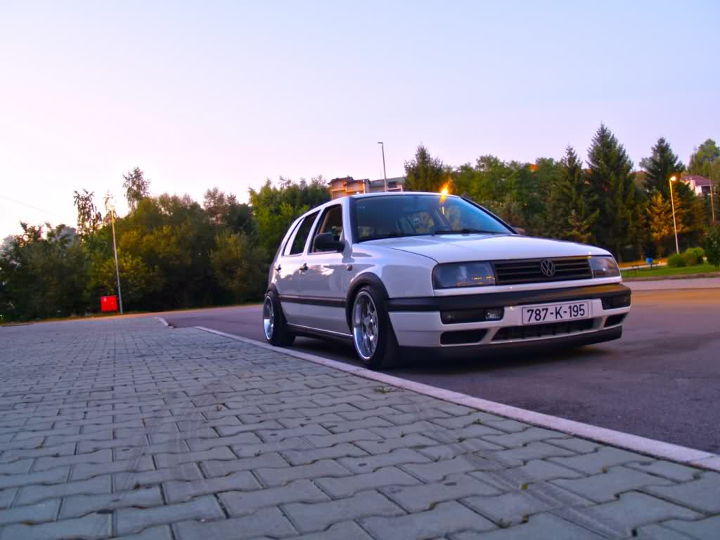 Description: A white car parked on the side of a road next to a red light pole and trees in the background.