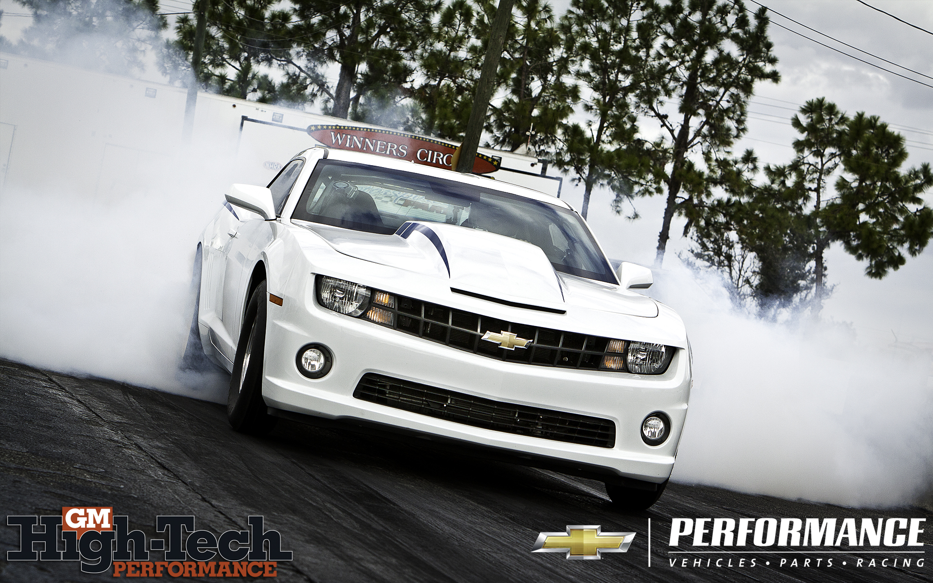 Description: A white car with a lot of smoke coming out of it's hood and hood is driving down a track.