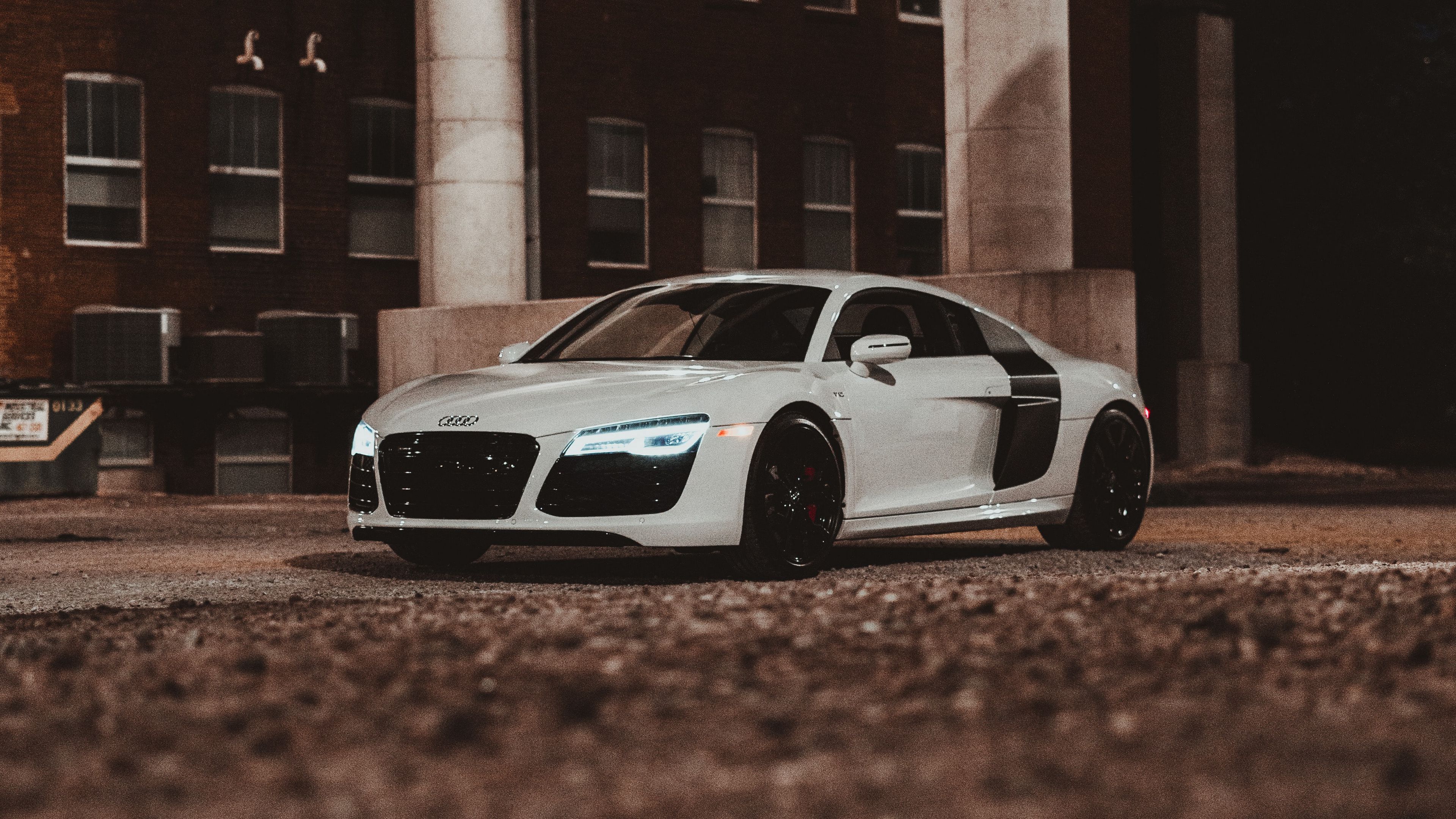Description: A white car parked in front of a building on a street corner with a bench in the background and a building in the background.