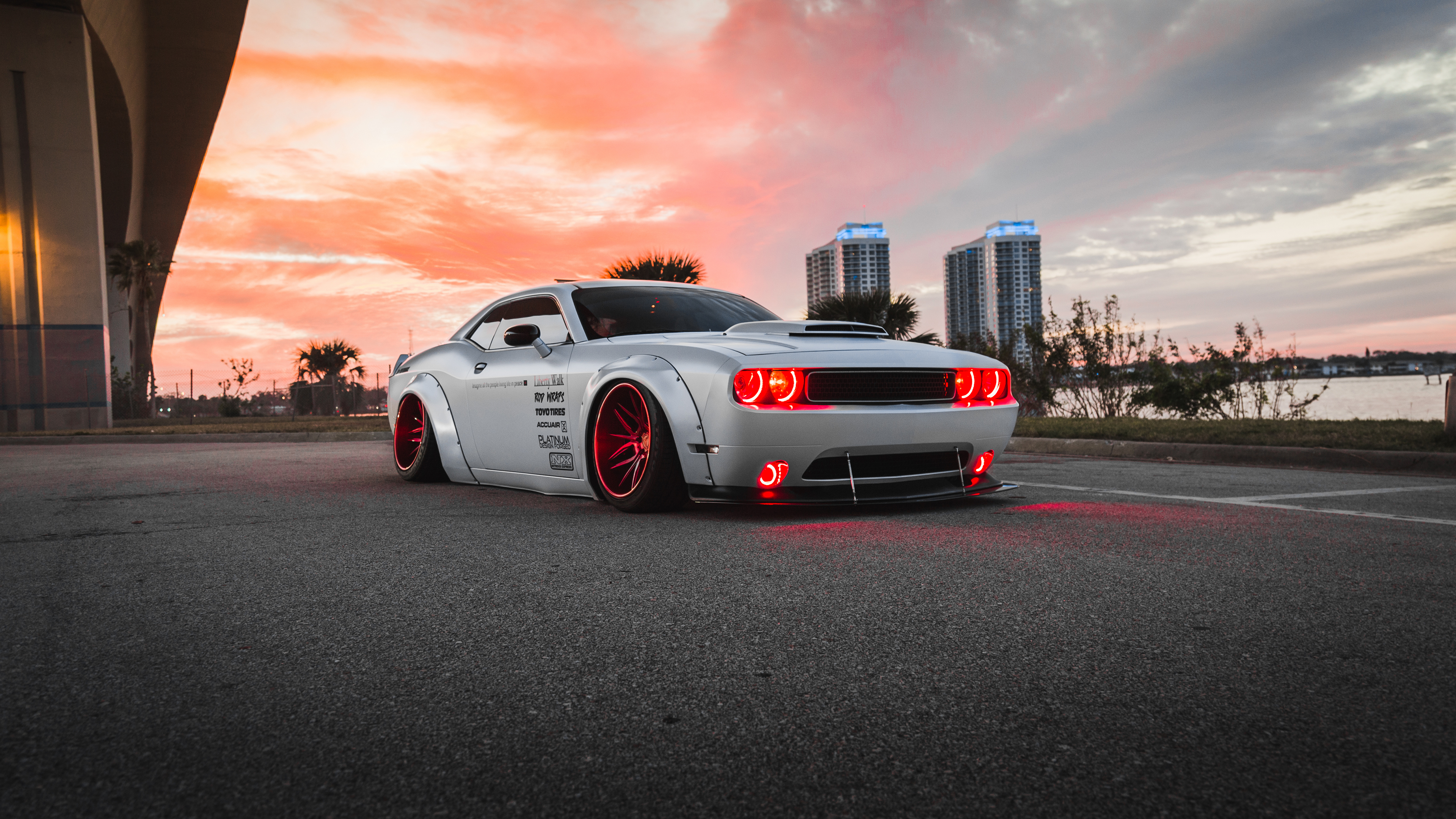 Description: A white car parked in a parking lot with a sunset in the background and a city skyline in the background.