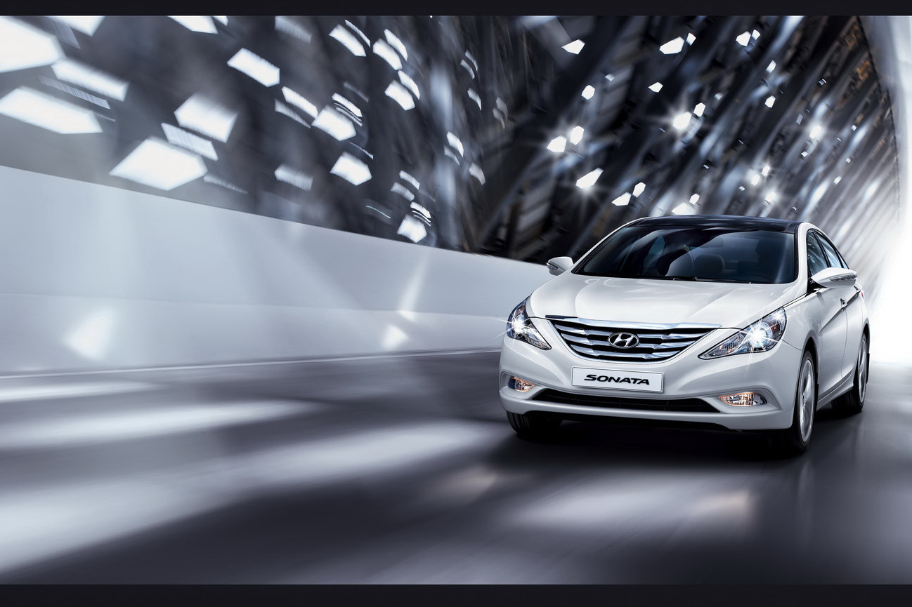 Description: A white car driving down a tunnel in a city with lights on it's sides and a white wall.