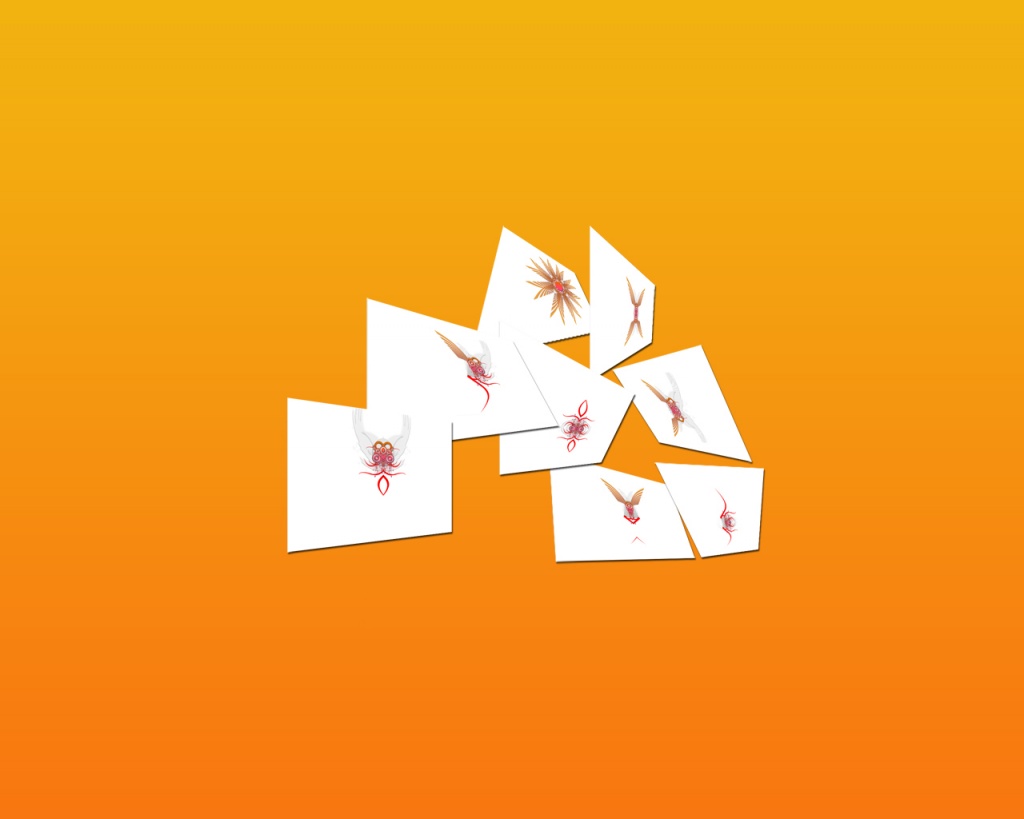 Description: A bunch of white cards with red designs on them on an orange background with a yellow background and a white rectangle with red designs on it.
