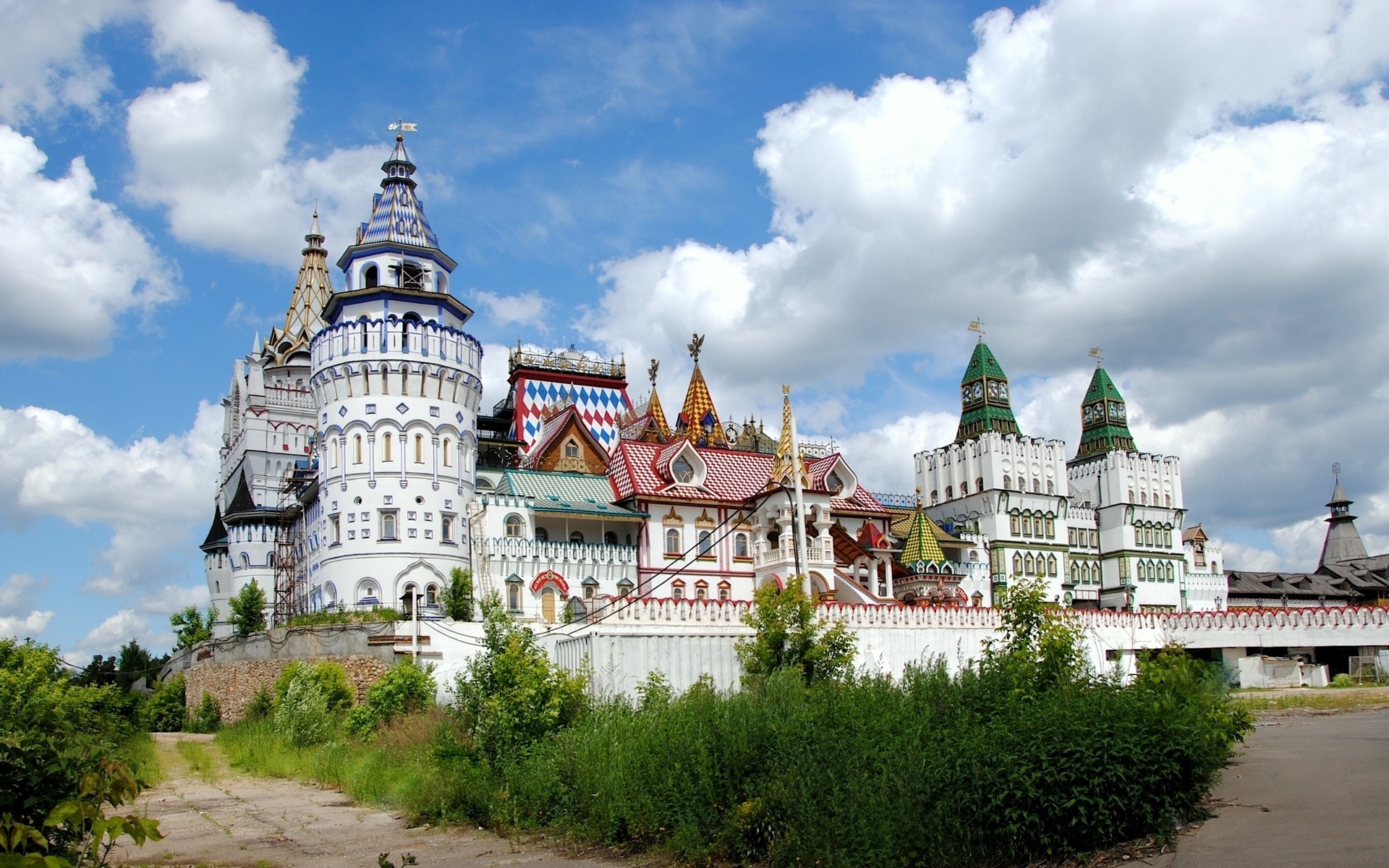 Description: A large white castle with a clock tower on top of it's side and a sky background with clouds.