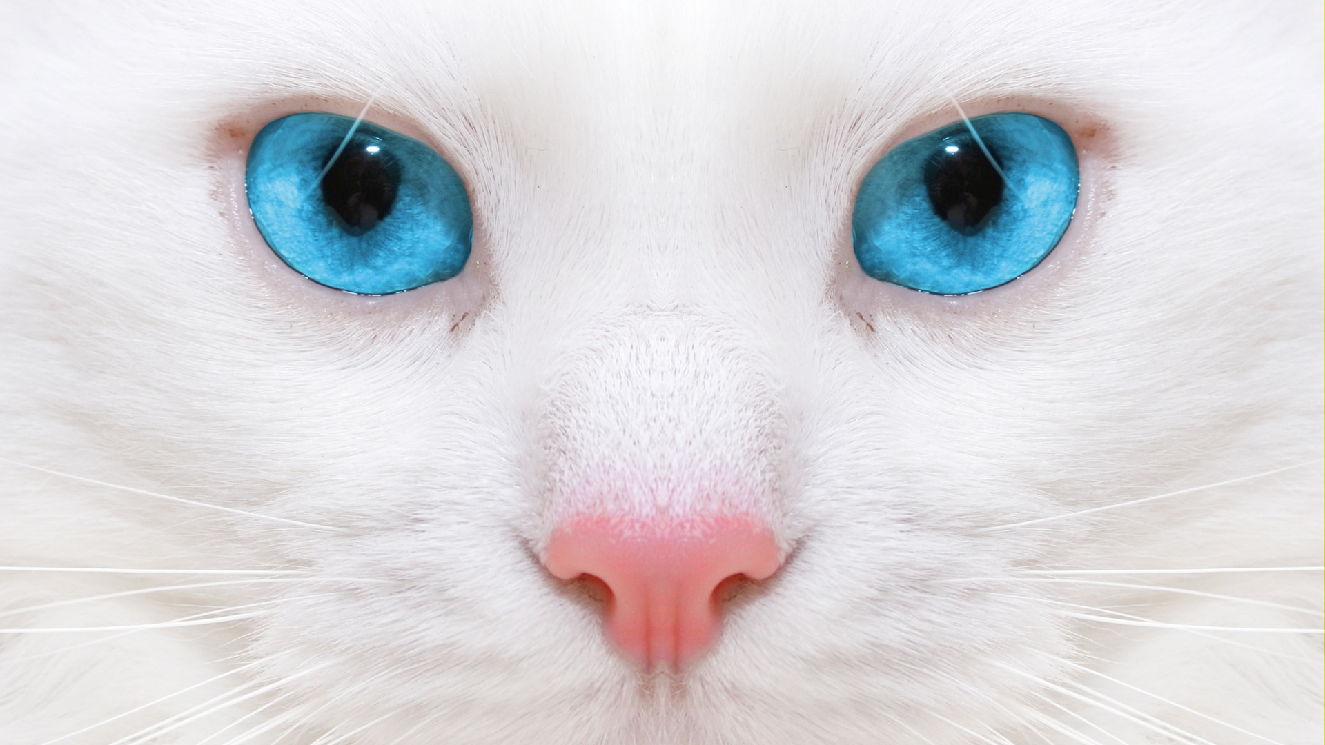 Description: A white cat with blue eyes and a pink nose is looking at the camera with a serious look on its face.