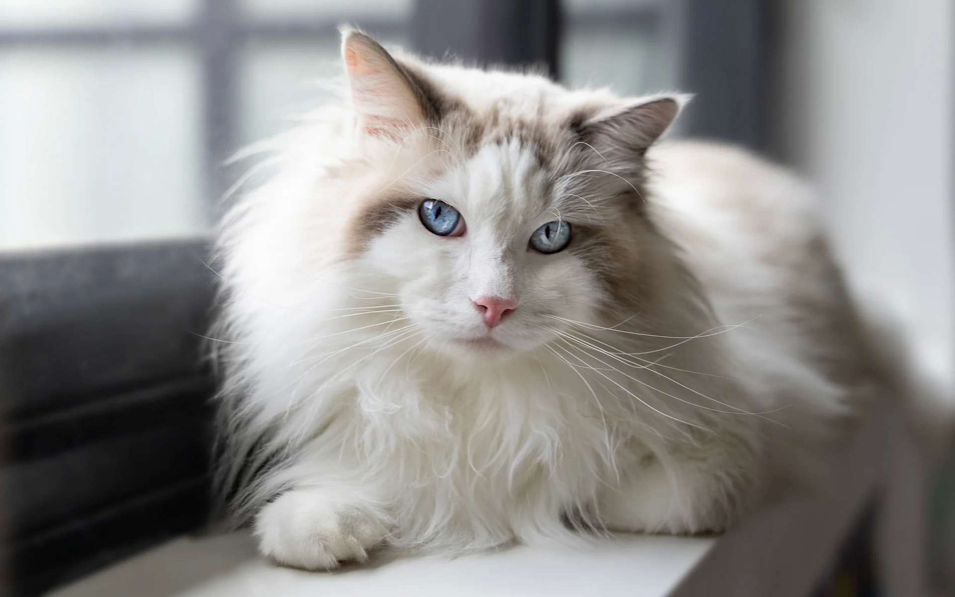 Description: A white cat with blue eyes sitting on a window sill looking at the camera with a serious look on its face.