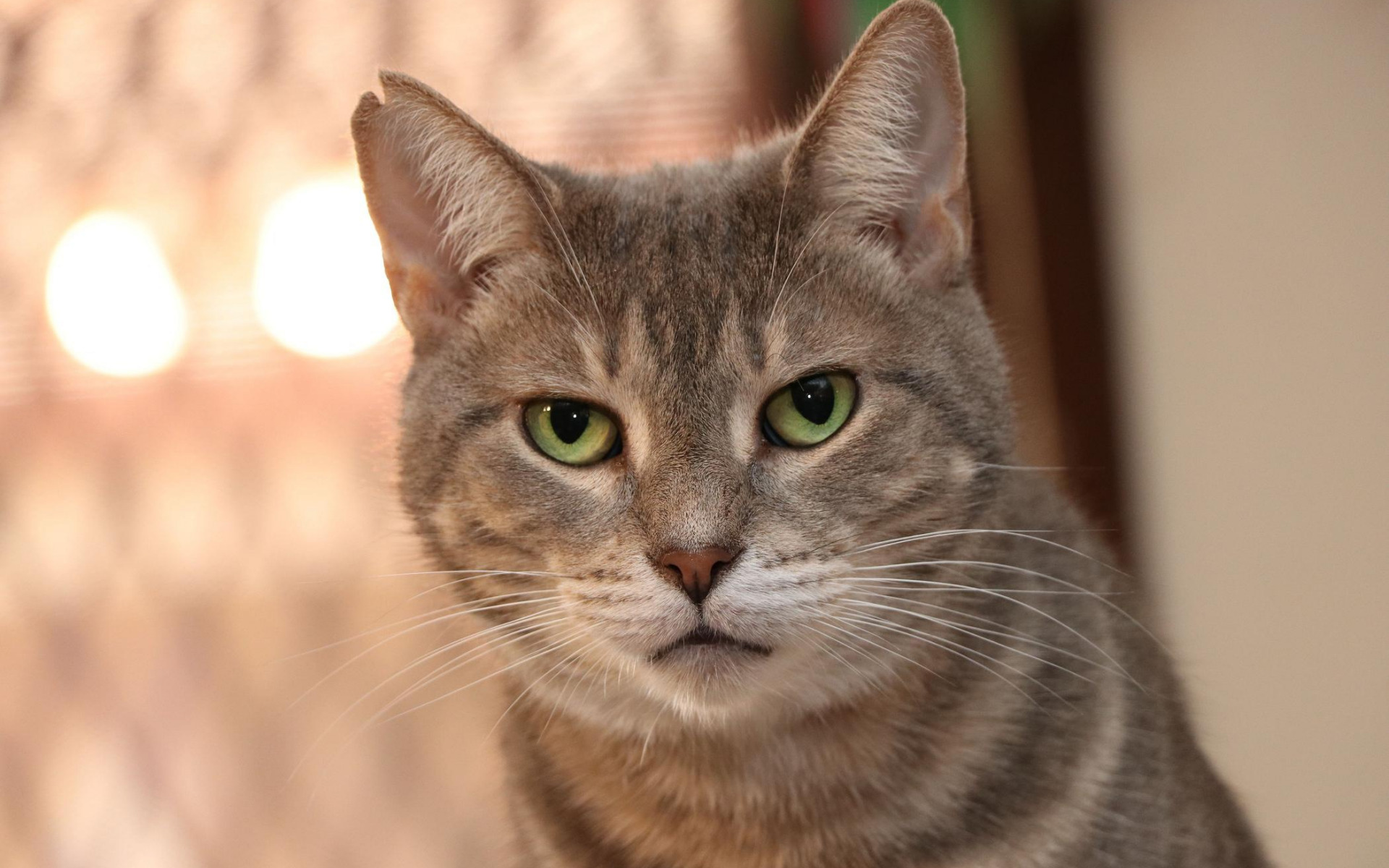 Description: A cat with green eyes looking at the camera with a blurry background of a window behind it and a curtain behind it.