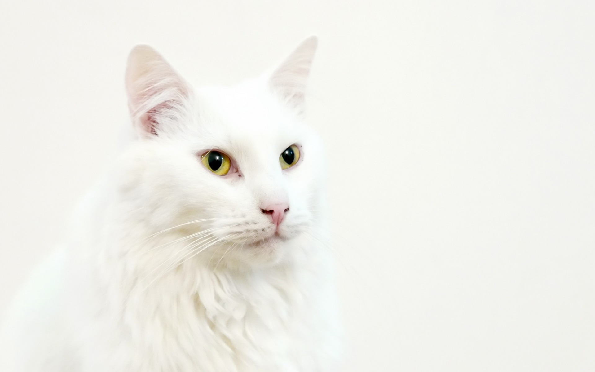 Description: A white cat with green eyes looking at the camera with a white background and a white wall behind it.