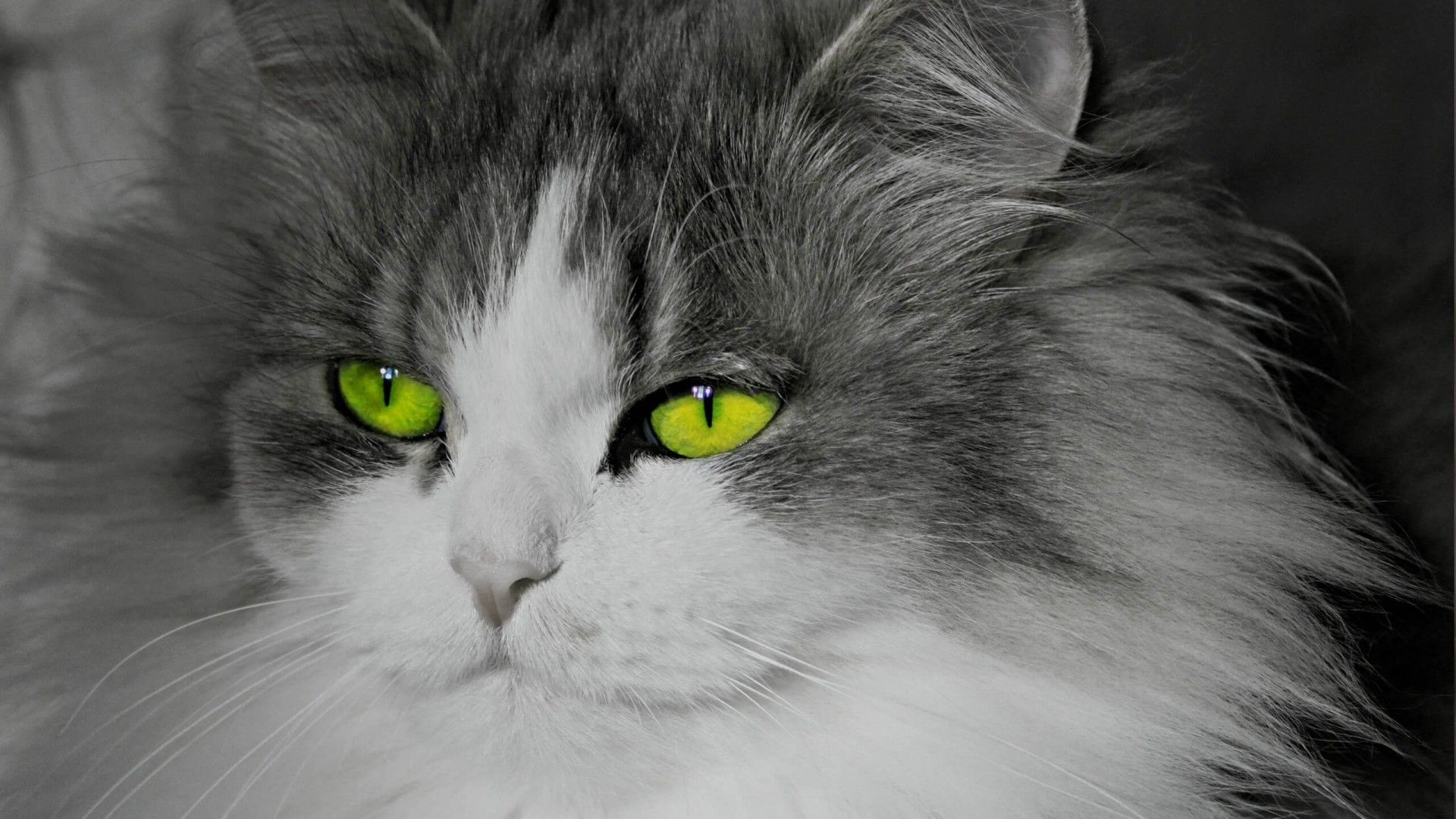 Description: A cat with green eyes and a white fur coat is looking at the camera with a serious look on its face.