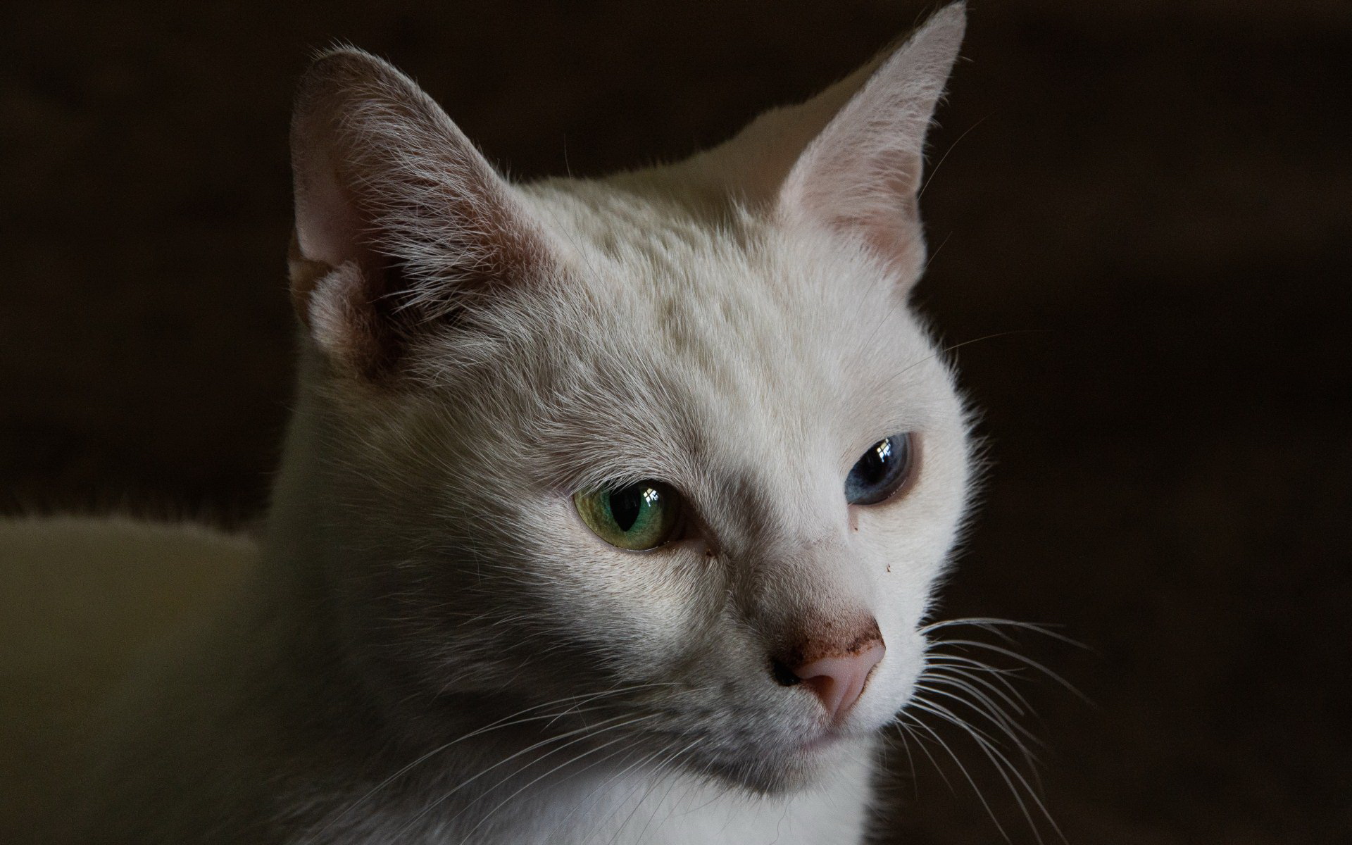 Description: A white cat with green eyes looking at the camera with a serious look on its face and chest.