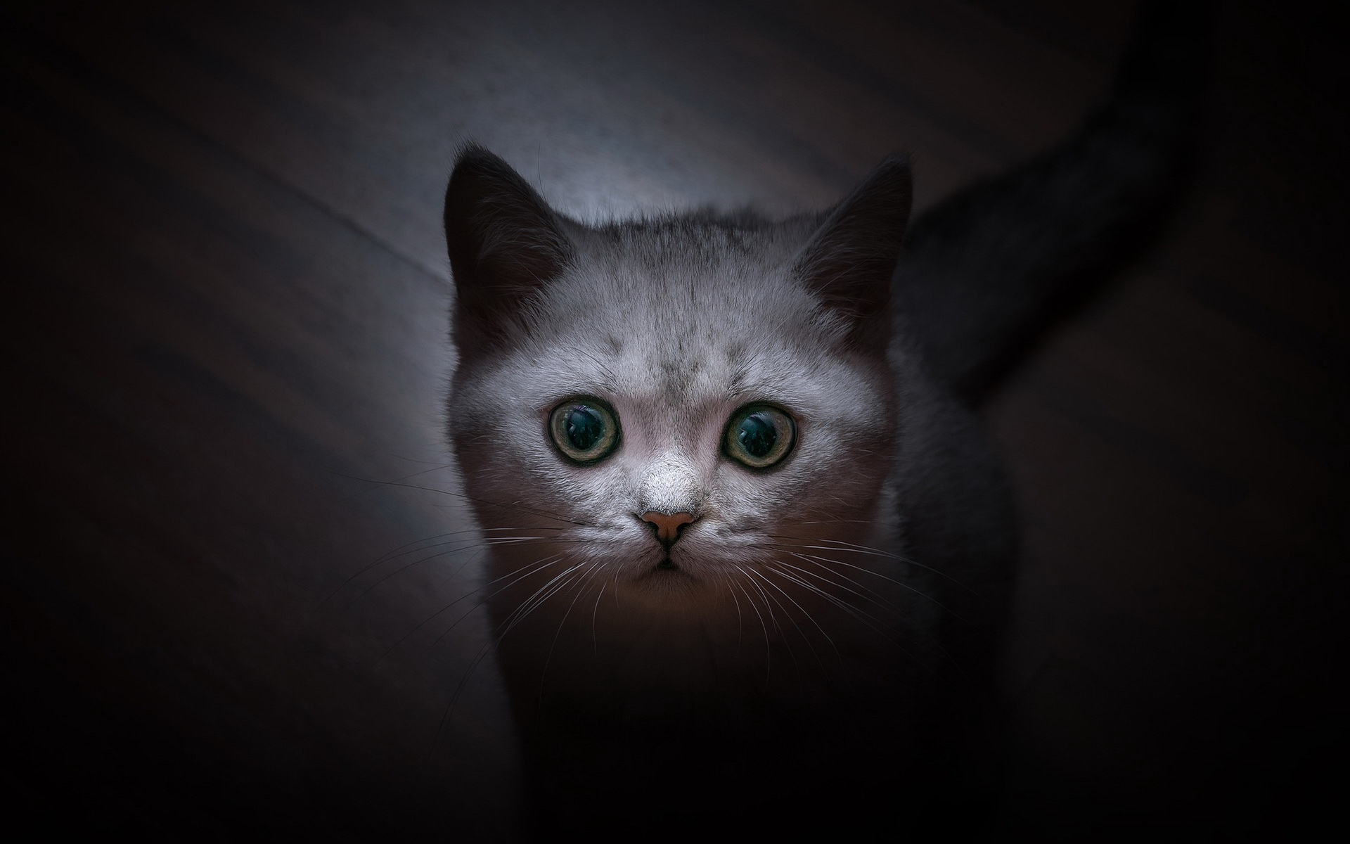 Description: A white cat with green eyes looking up at the camera with a dark background and a wooden floor with a black background.