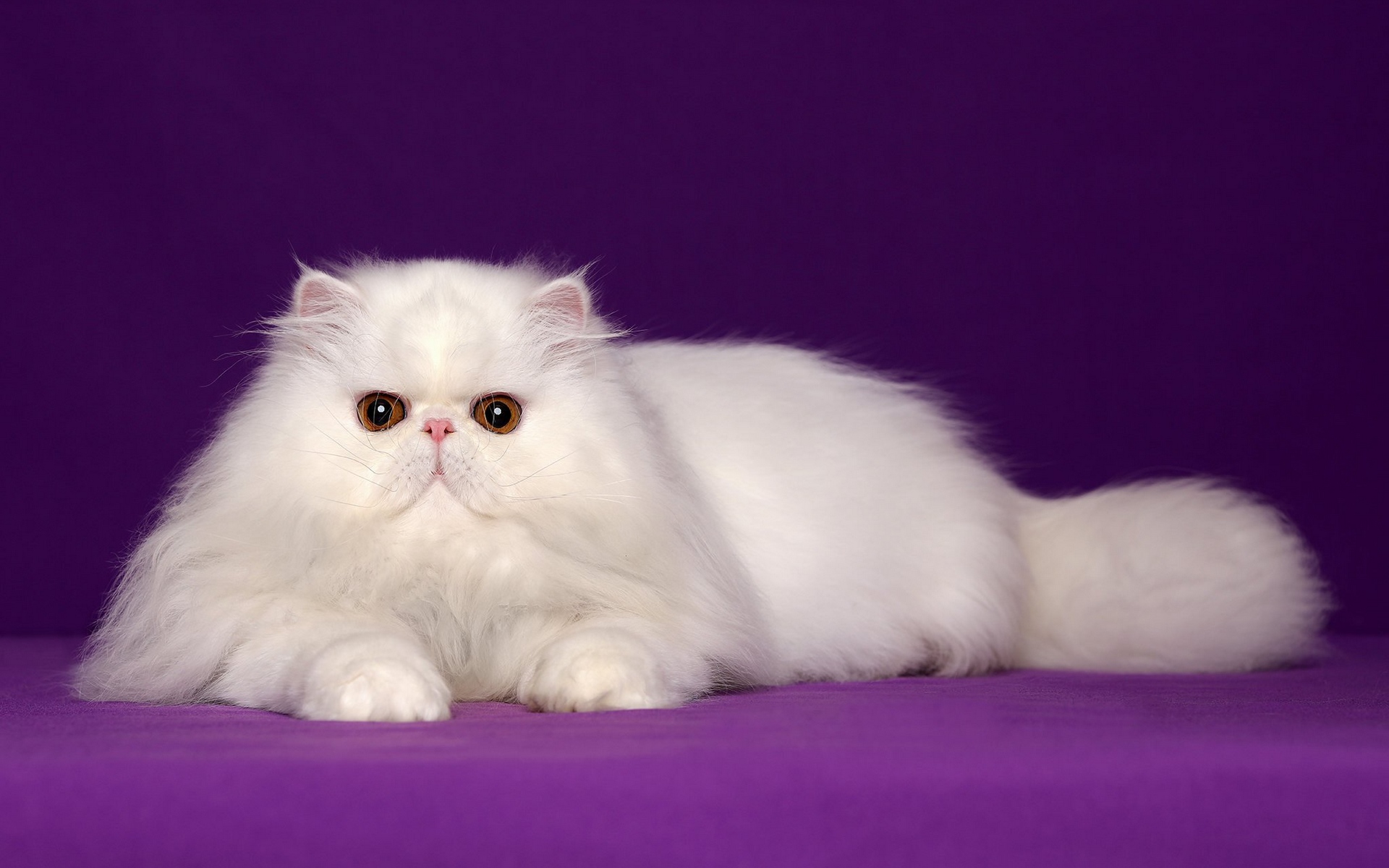 Description: A white cat with a long hair laying on a purple surface with a purple background and a purple backdrop.