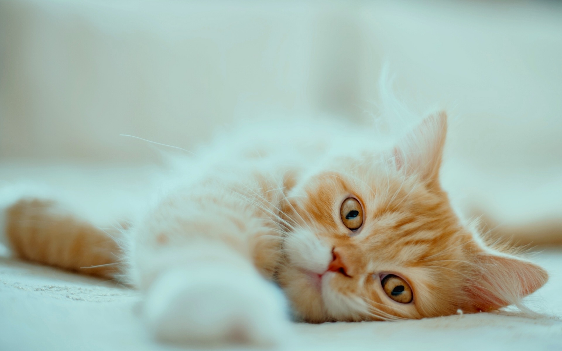 Description: A cat laying on its back on a bed with its eyes wide open and eyes wide open.
