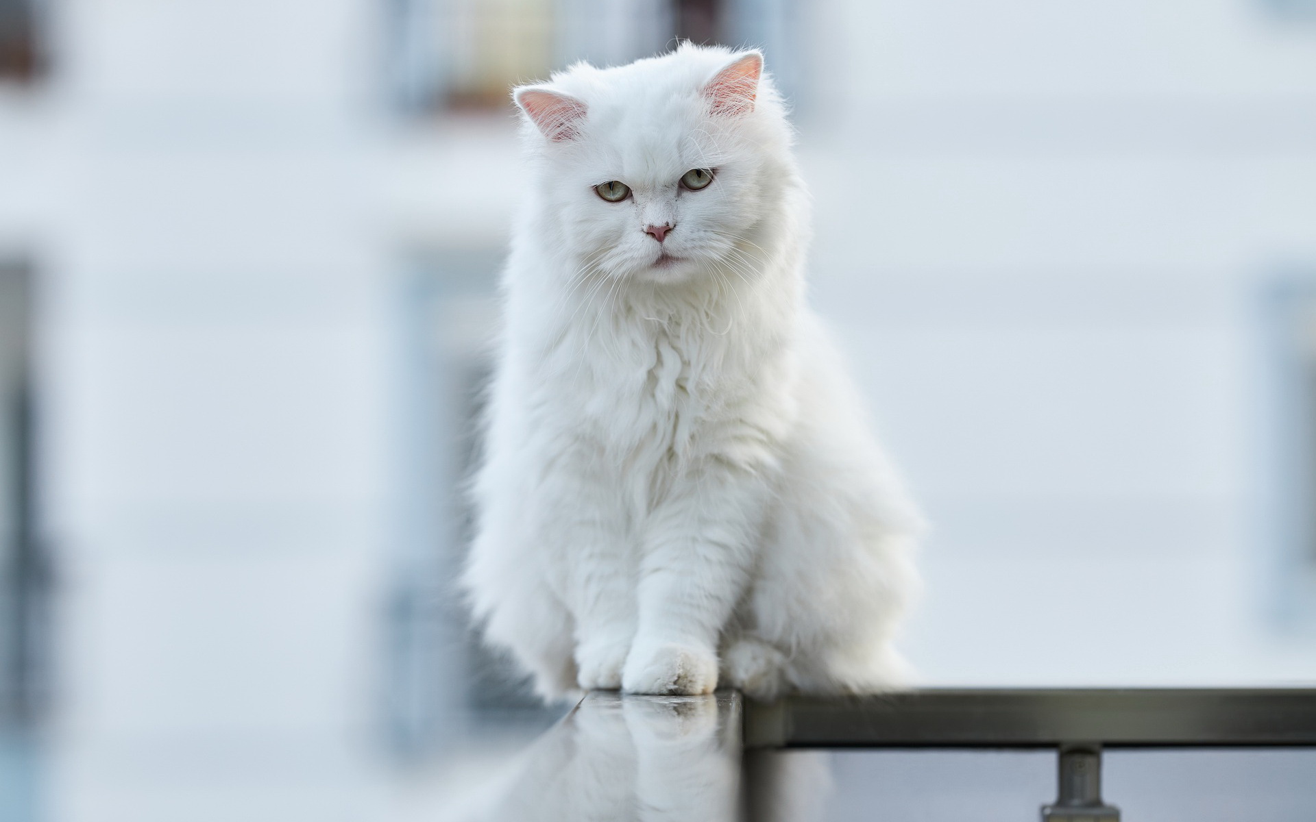 Description: A white cat sitting on a railing outside a building with a building in the background and a building across the street.