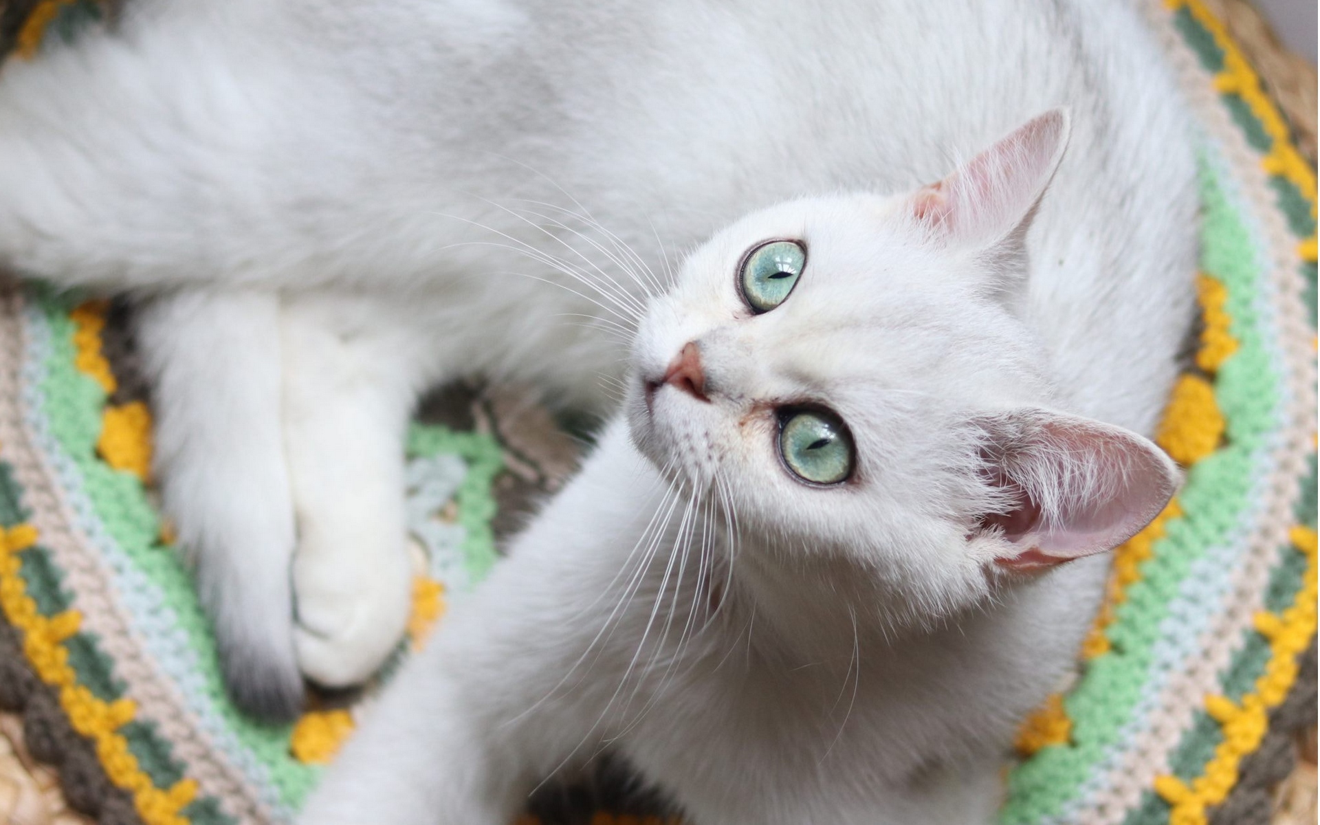 Description: A white cat laying on top of a rug on the floor next to a cat toy and a cat toy.