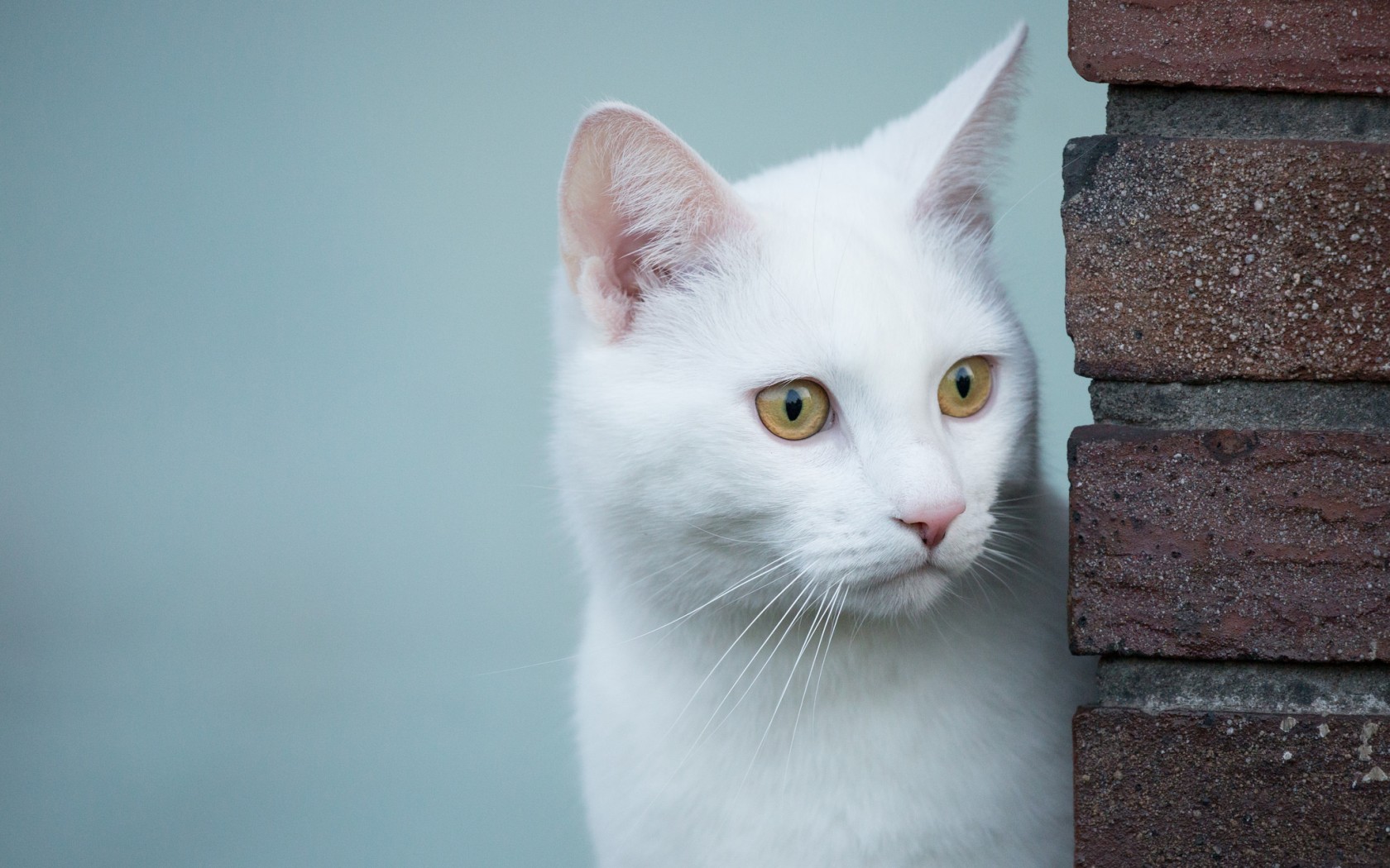 Description: A white cat with yellow eyes looking out from behind a brick wall with a brick wall behind it and a brick wall behind it.