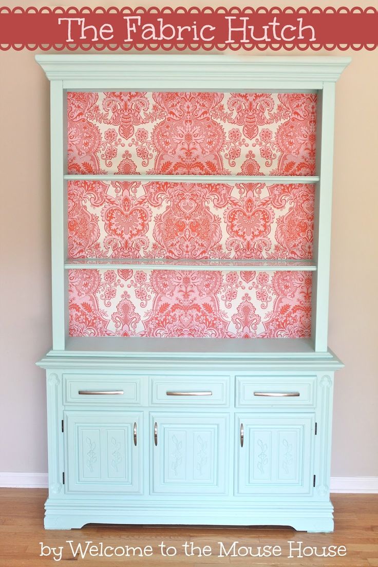 Description: A white china cabinet with a pink wallpaper on it and a red and white wallpaper behind it.