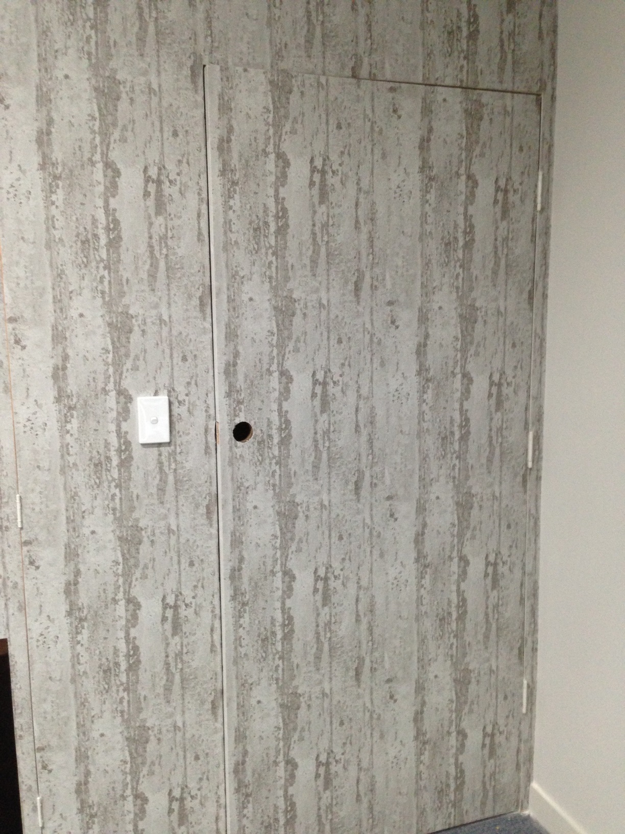 Description: A white closet with a door and a black floor in a room with a wallpapered wall and a toilet.
