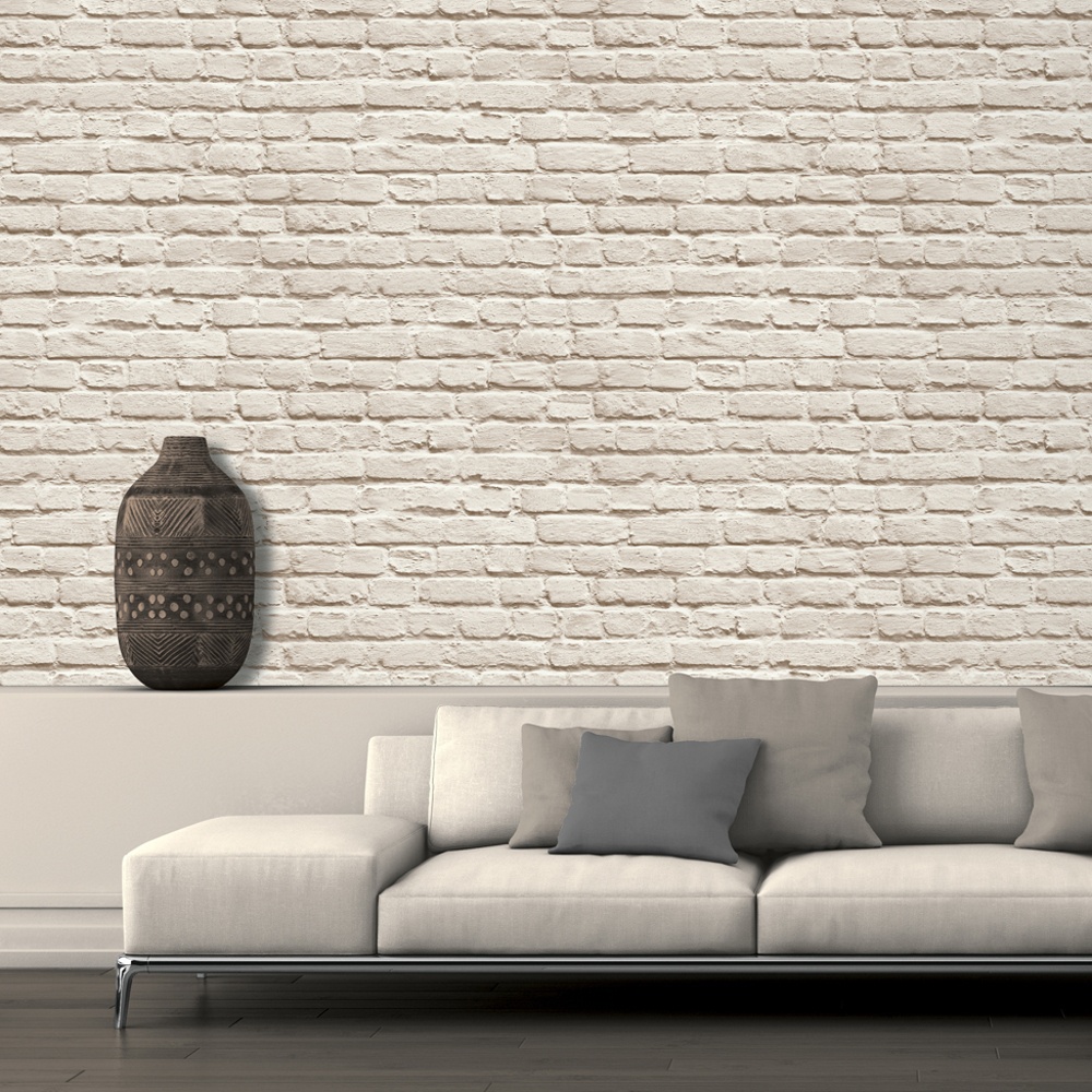 Description: A white couch sitting in front of a brick wall with a vase on top of it and a vase on the side.