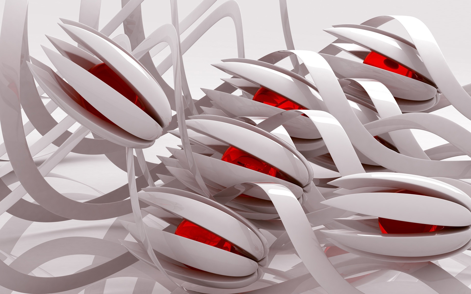 Description: A group of white objects with red eyes in a white room with a white floor and walls and a white floor.