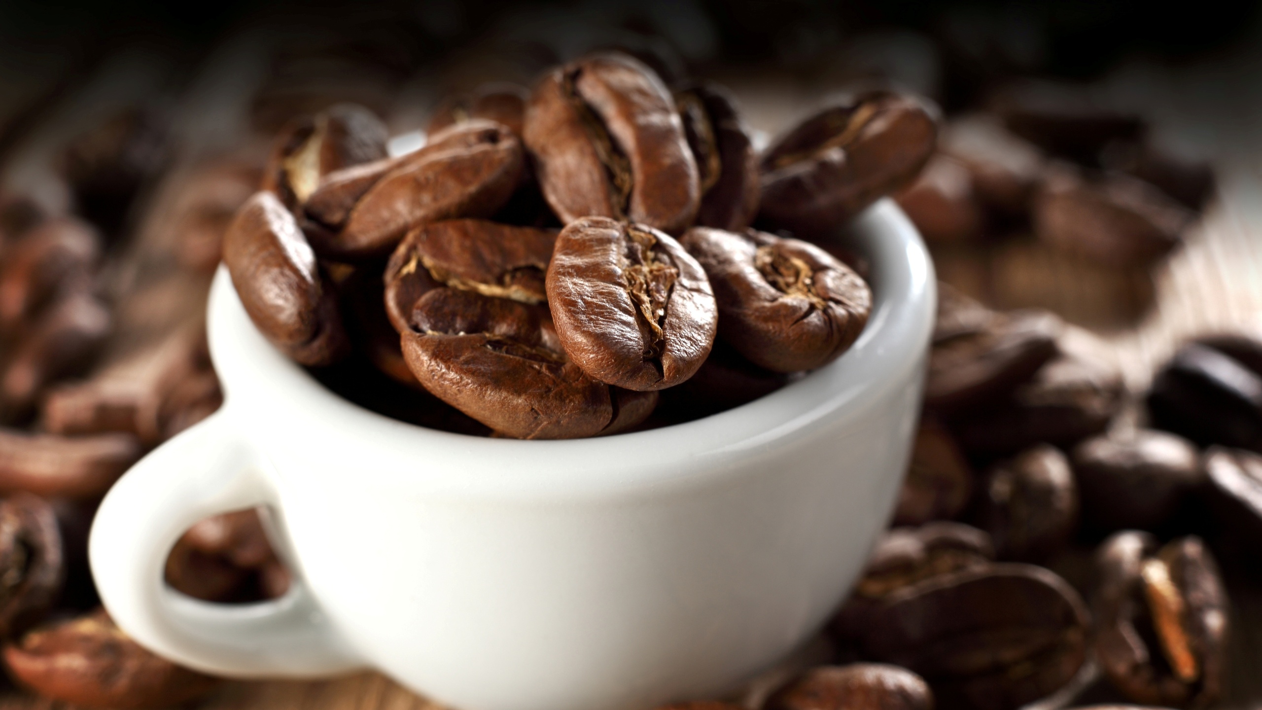 Description: A white cup filled with coffee beans on top of a wooden table next to a pile of coffee beans.