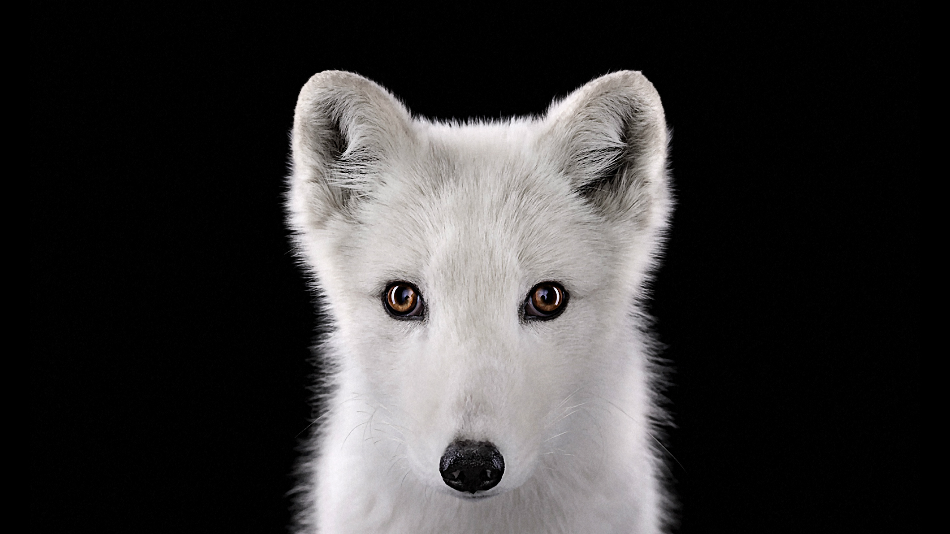 Description: A white dog with brown eyes looking at the camera with a black background and a black background behind it.