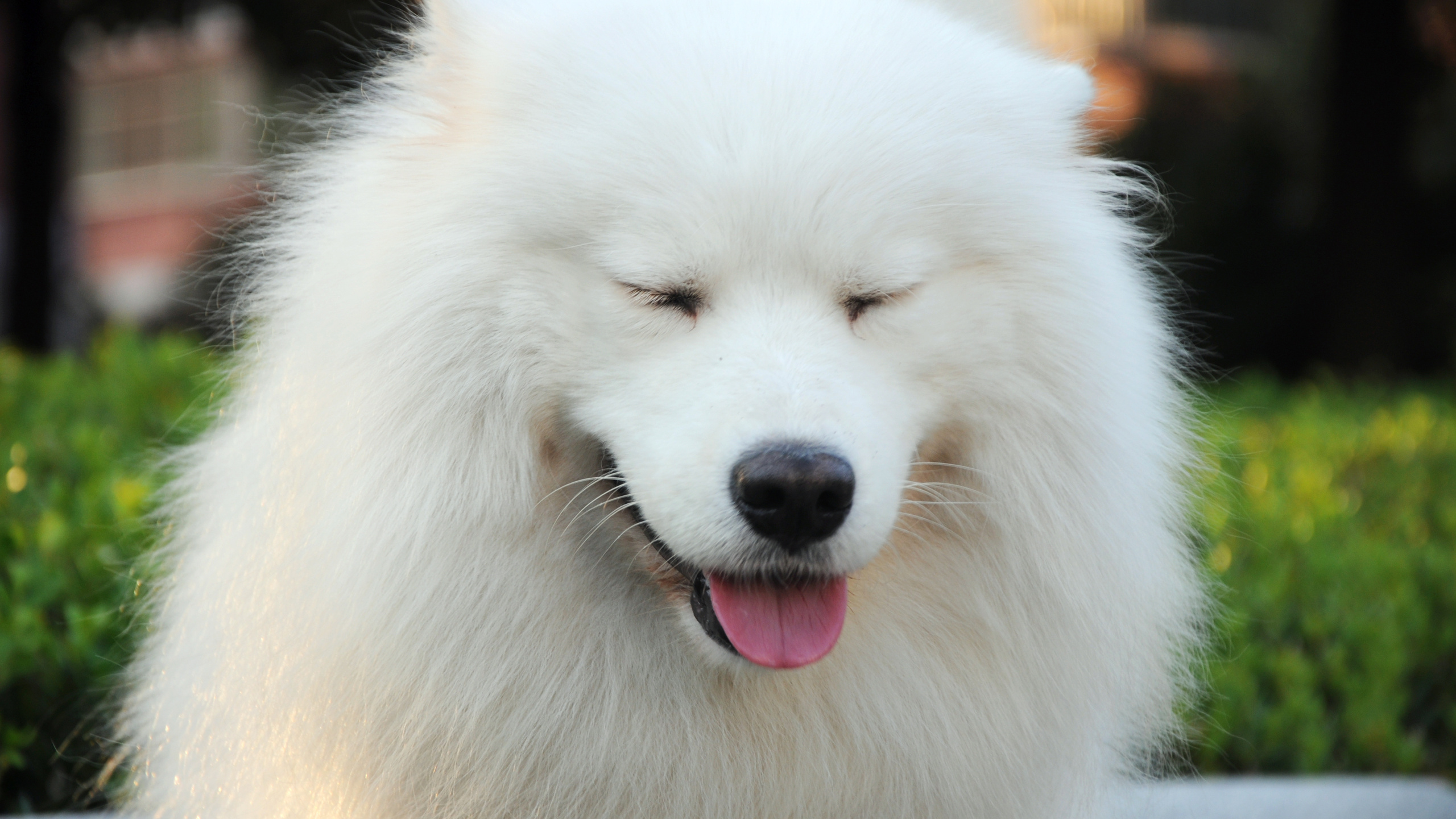 Description: A white dog with its eyes closed and his head down.