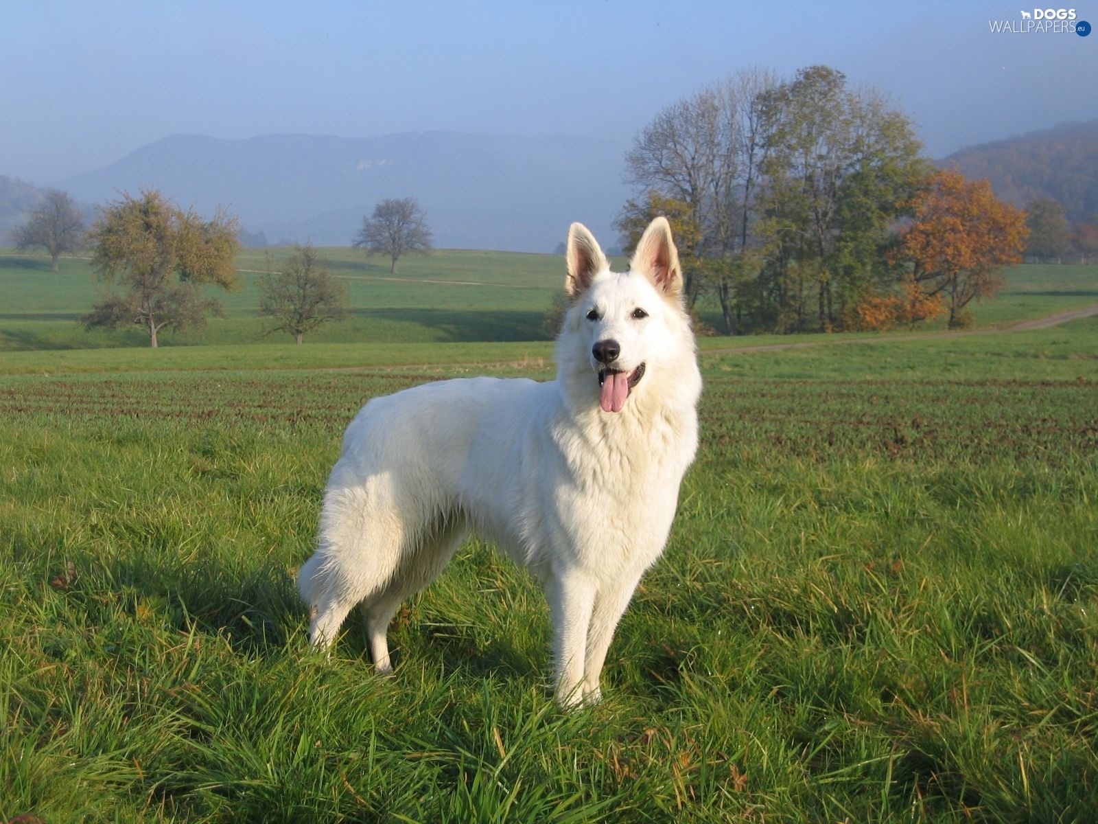 Description: A white dog standing in a field with mountains in the background and grass in the foreground.