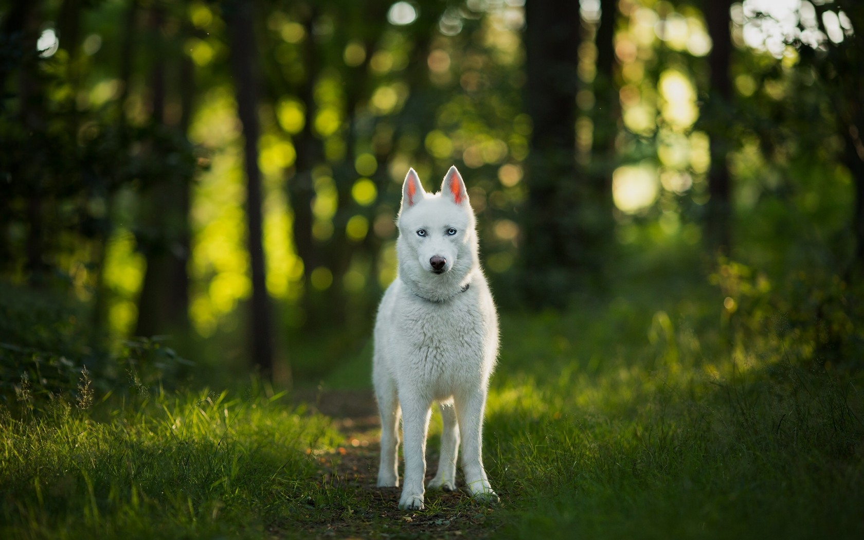 Description: A white dog standing in the middle of a forest with trees in the background and grass in the foreground.