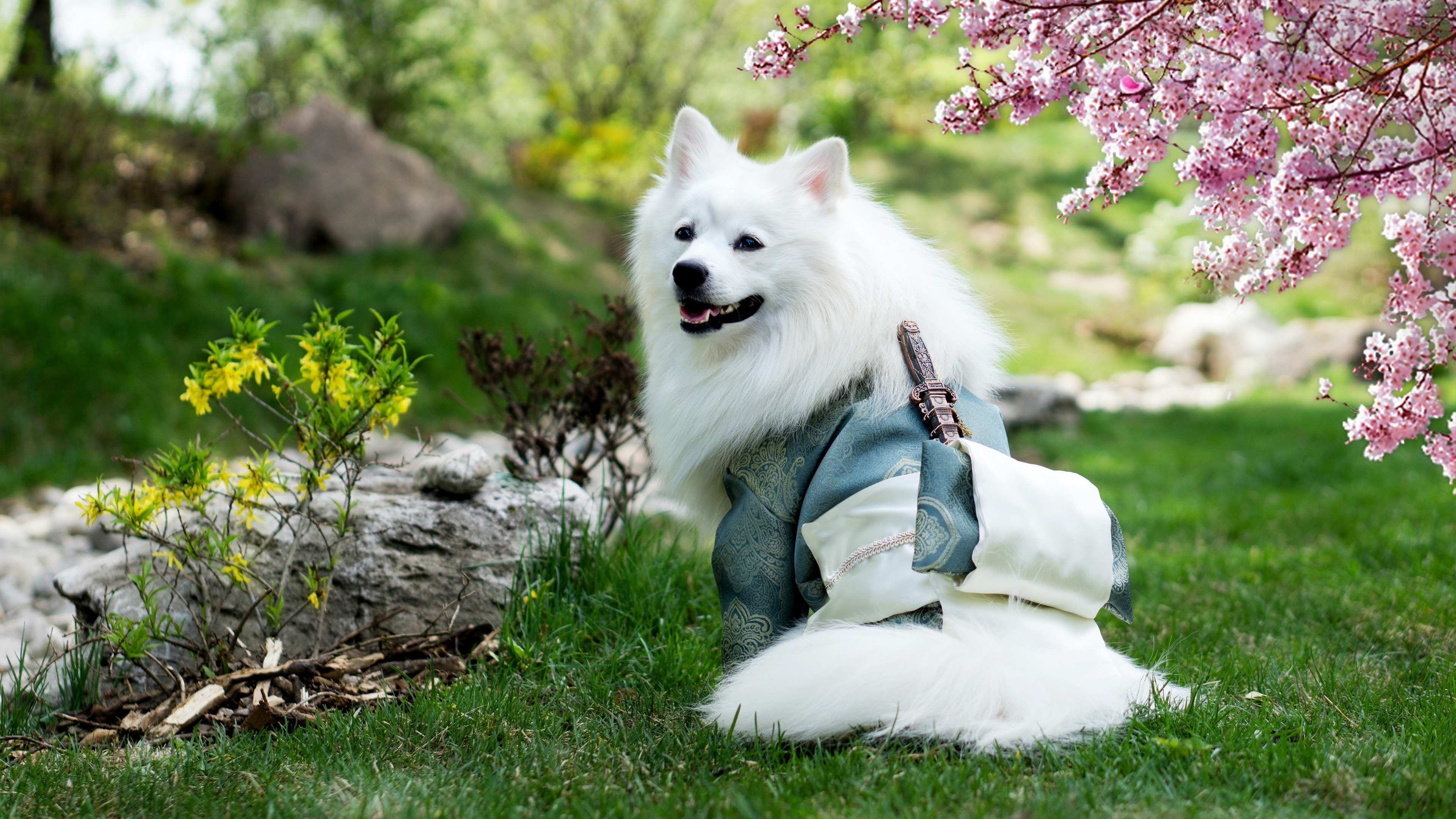 Description: A white dog sitting in the grass with a jacket on it's back and a pink flower behind it.