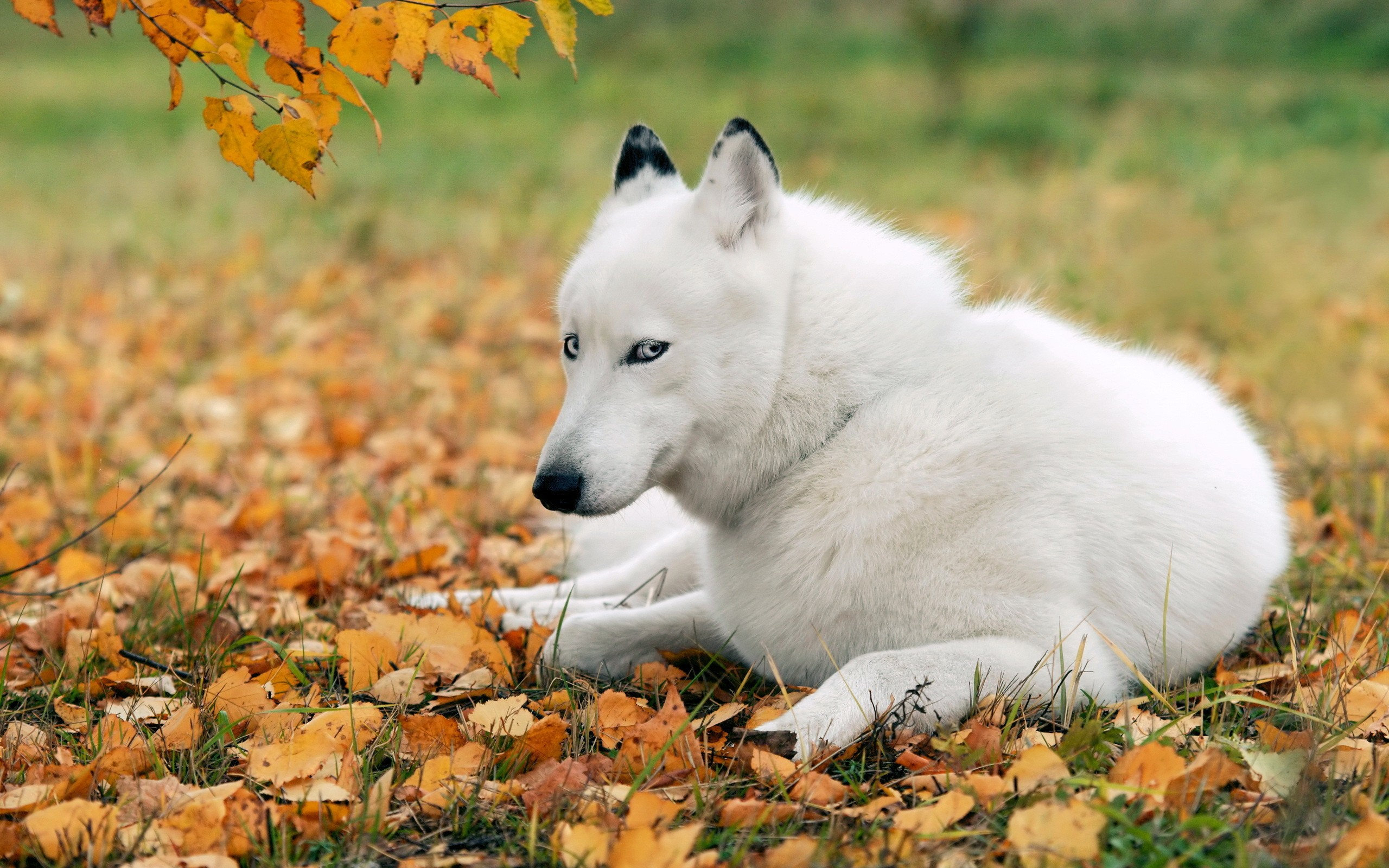 Description: A white dog laying in a field of leaves next to a tree with yellow leaves on it's ground.
