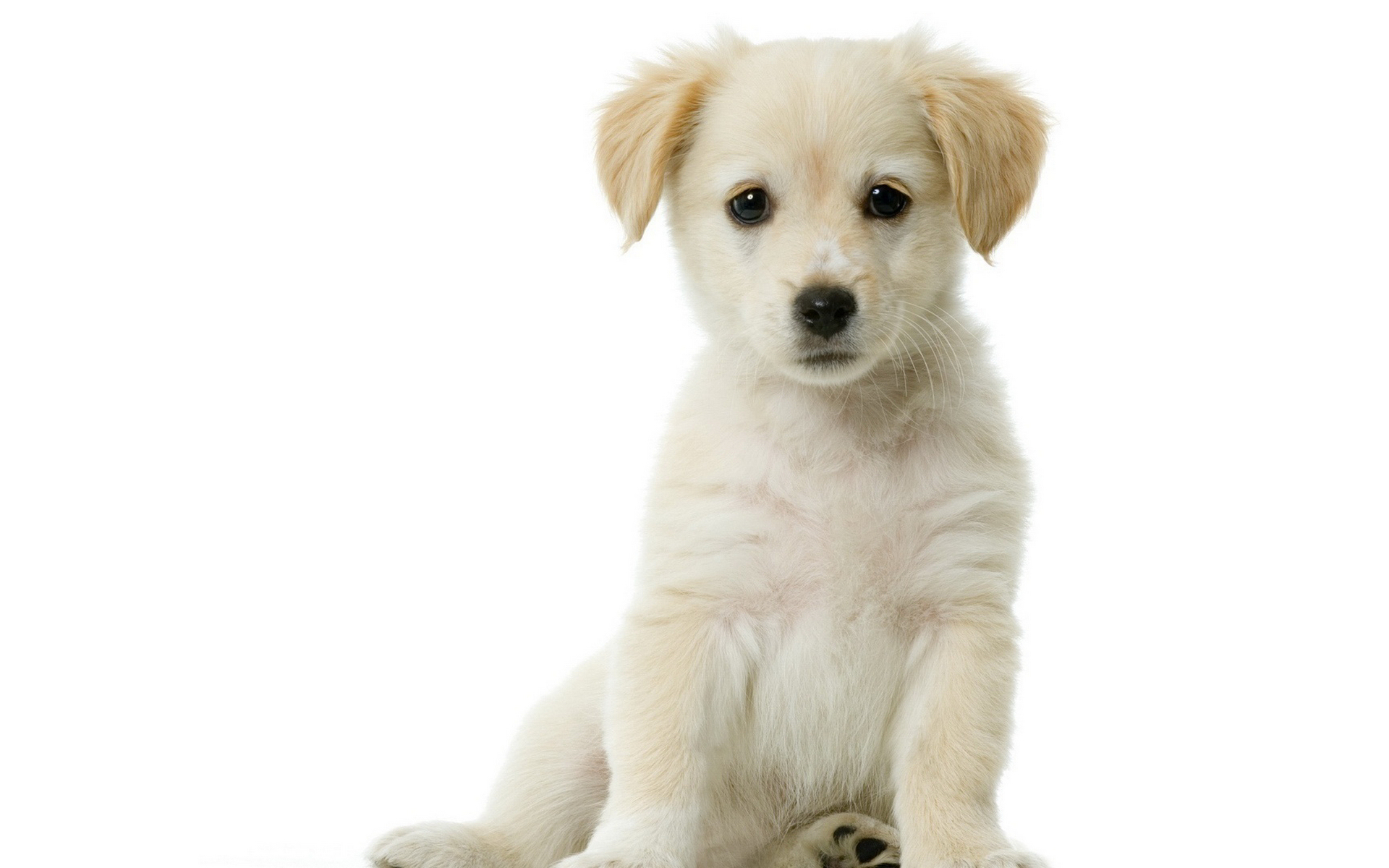 Description: A small white dog sitting on a white surface with a white background and a black nose and paw on the ground.