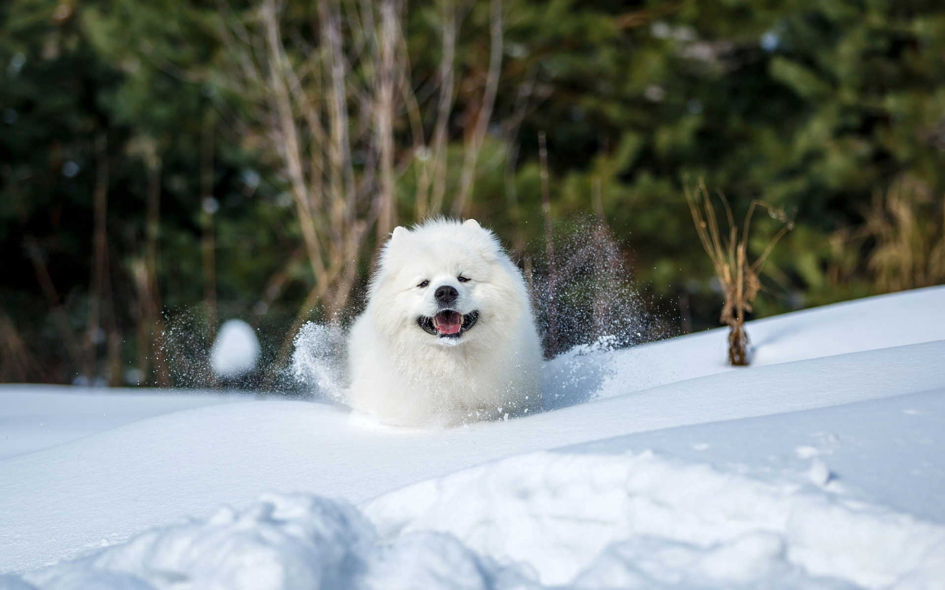 Description: A white dog running through the snow in the woods with trees in the background and snow on the ground.