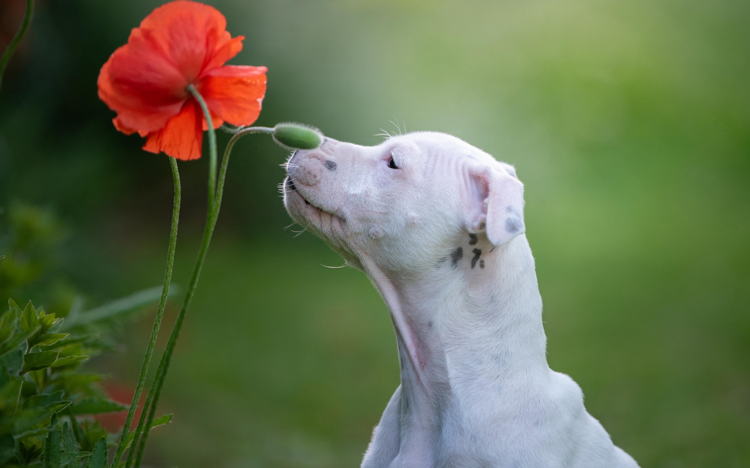Description: A white dog smelling a red flower in a field of grass and grass with a blurry background of grass and a red flower.
