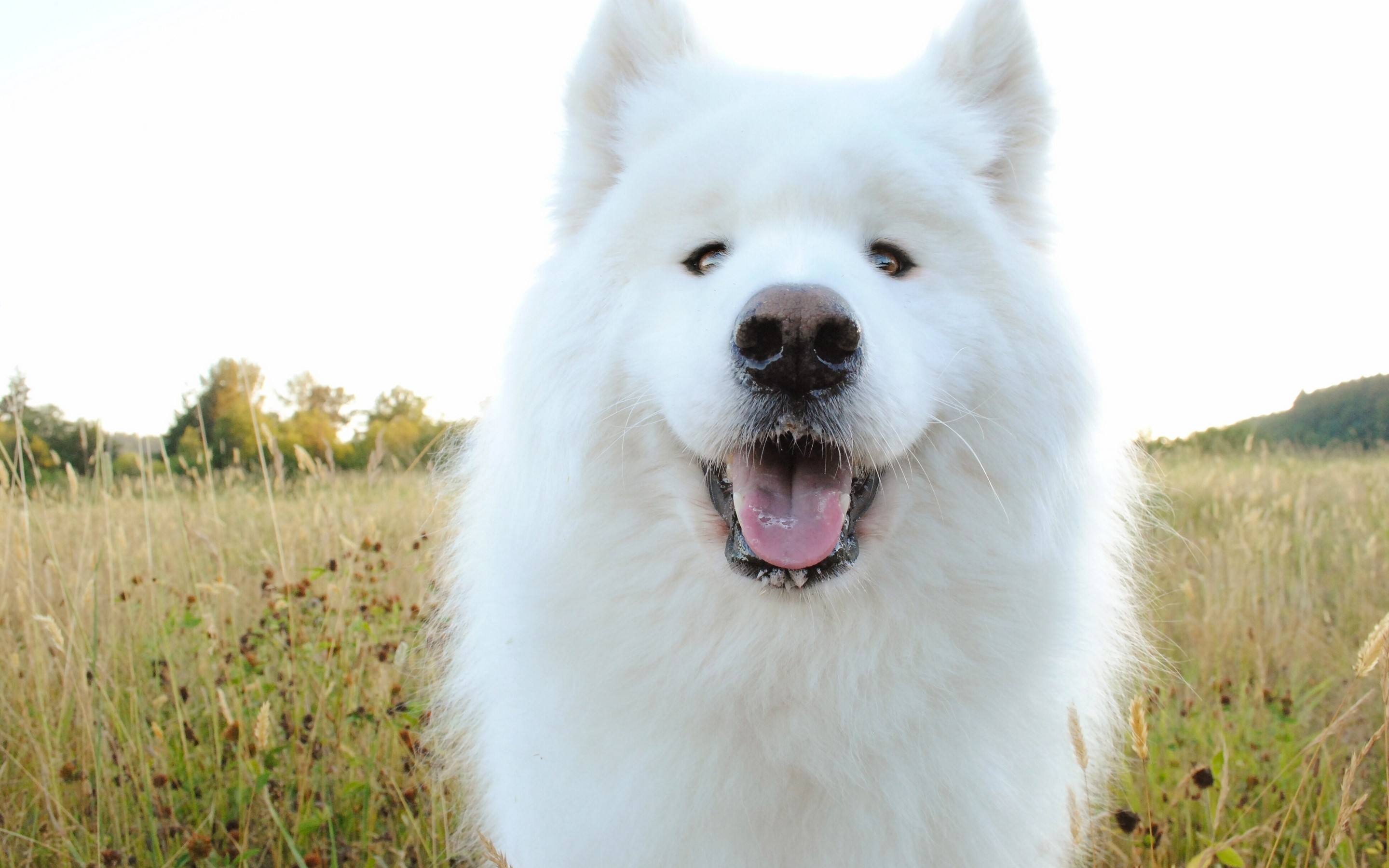 Description: A white dog standing in a field of tall grass with his tongue out and his eyes open and his tongue out.