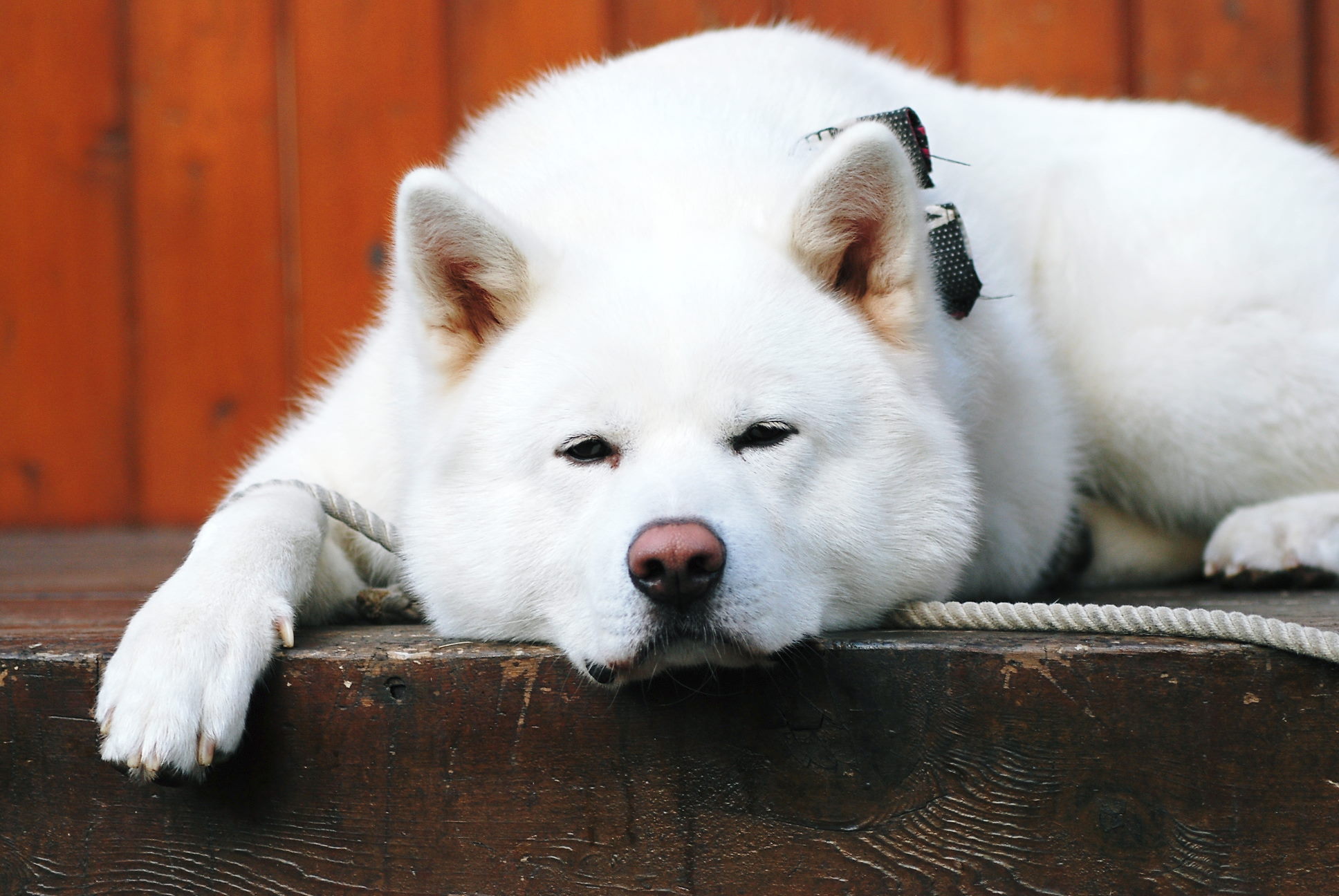 Description: A white dog laying on a wooden surface with a rope around it's neck and eyes closed.