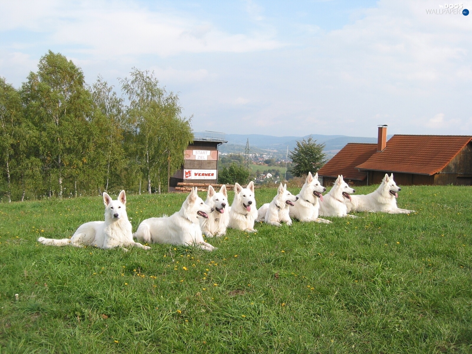 Description: A group of white dogs laying in a field of grass with a house in the background and a sky background.
