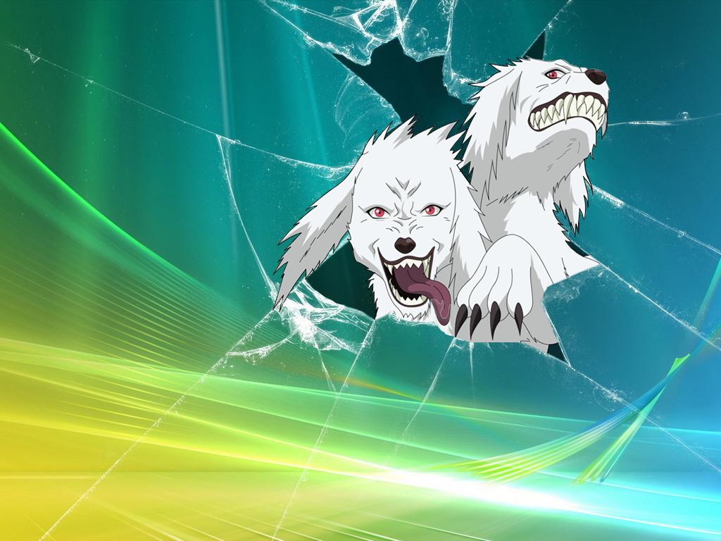 Description: A couple of white dogs standing next to each other on a window sill with a green and yellow background.
