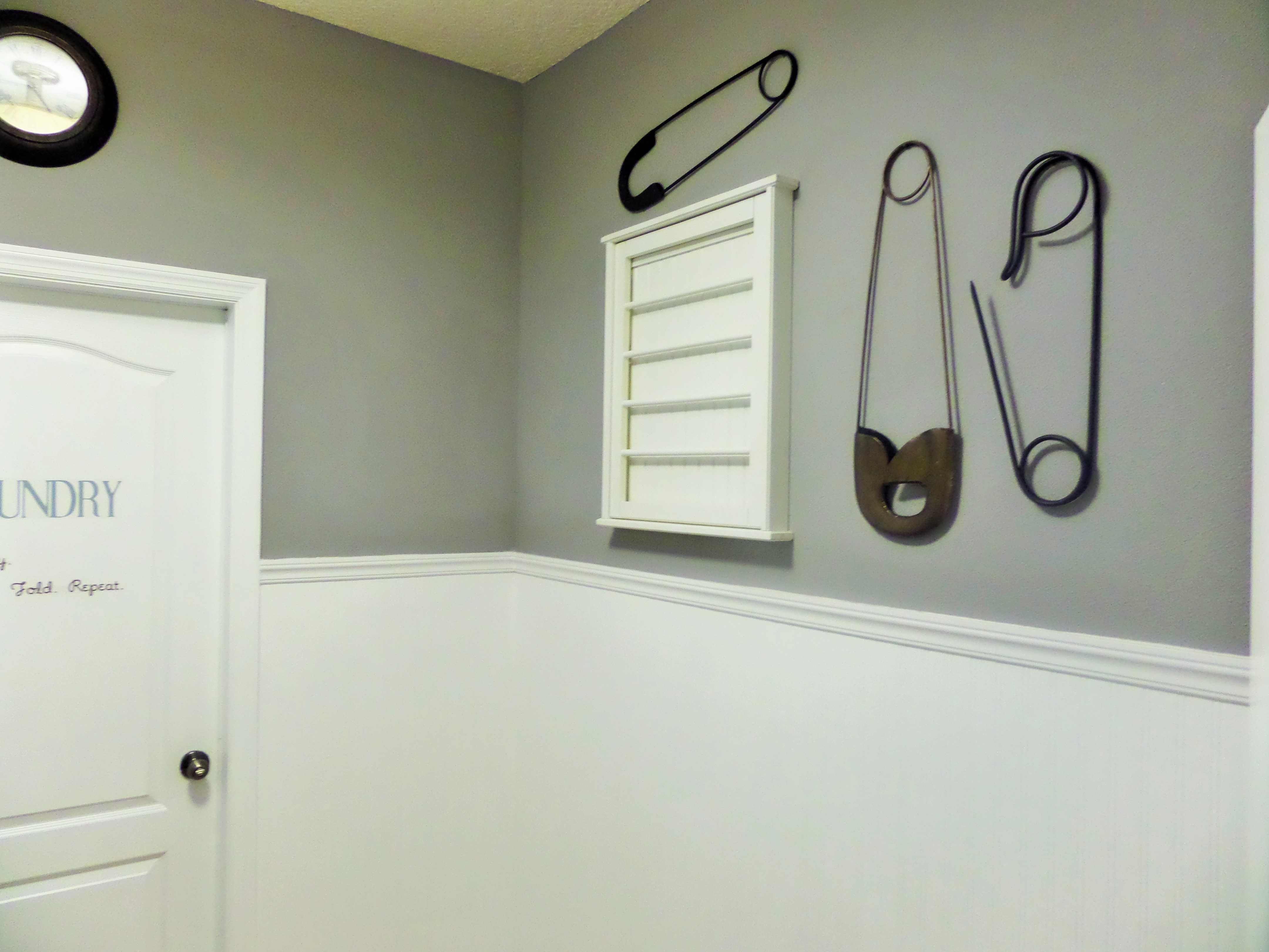 Description: A white door with scissors and a pair of scissors on the wall above it and a window above it.
