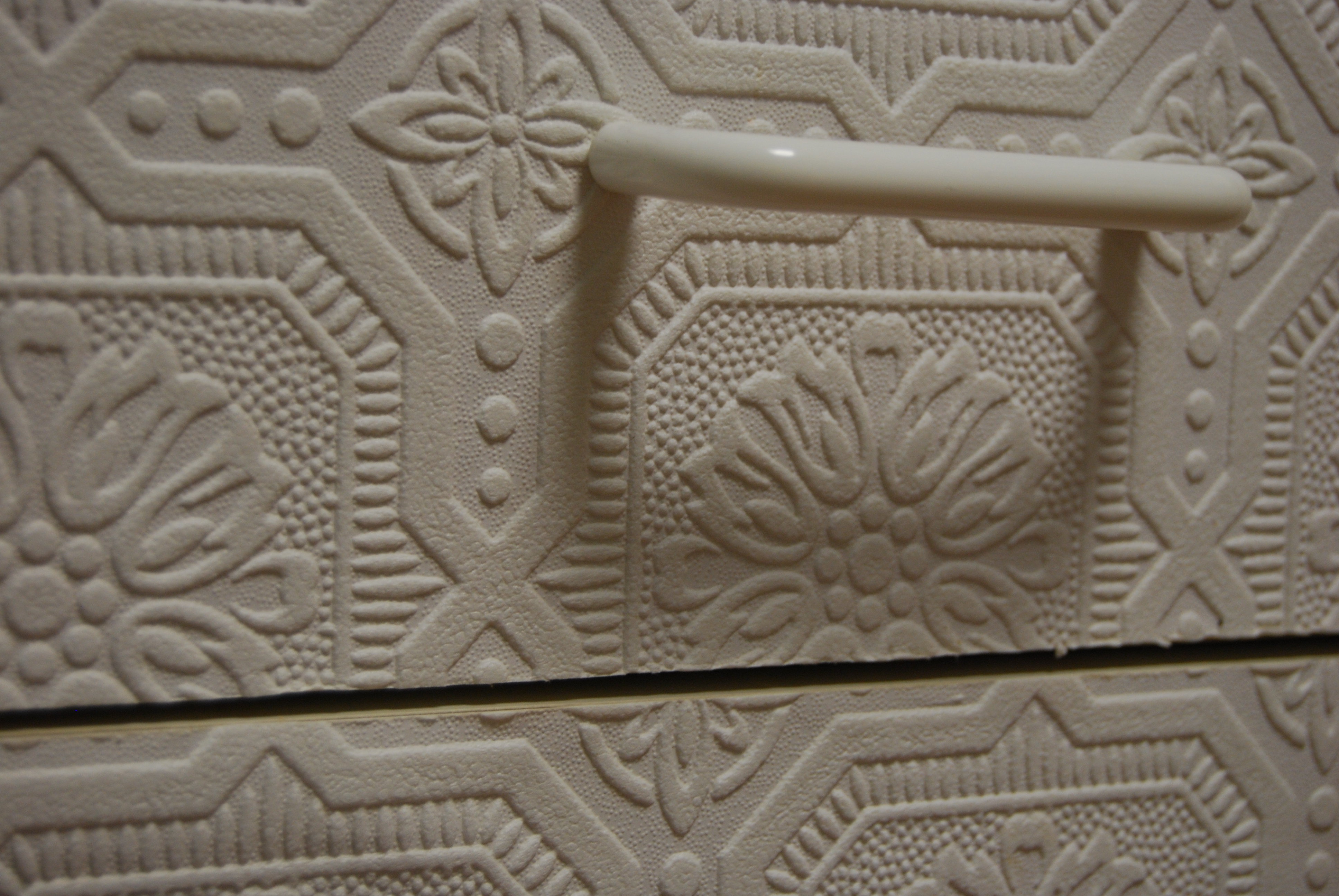 Description: A close up of a white drawer with a handle on it's side and a pattern on the drawer.