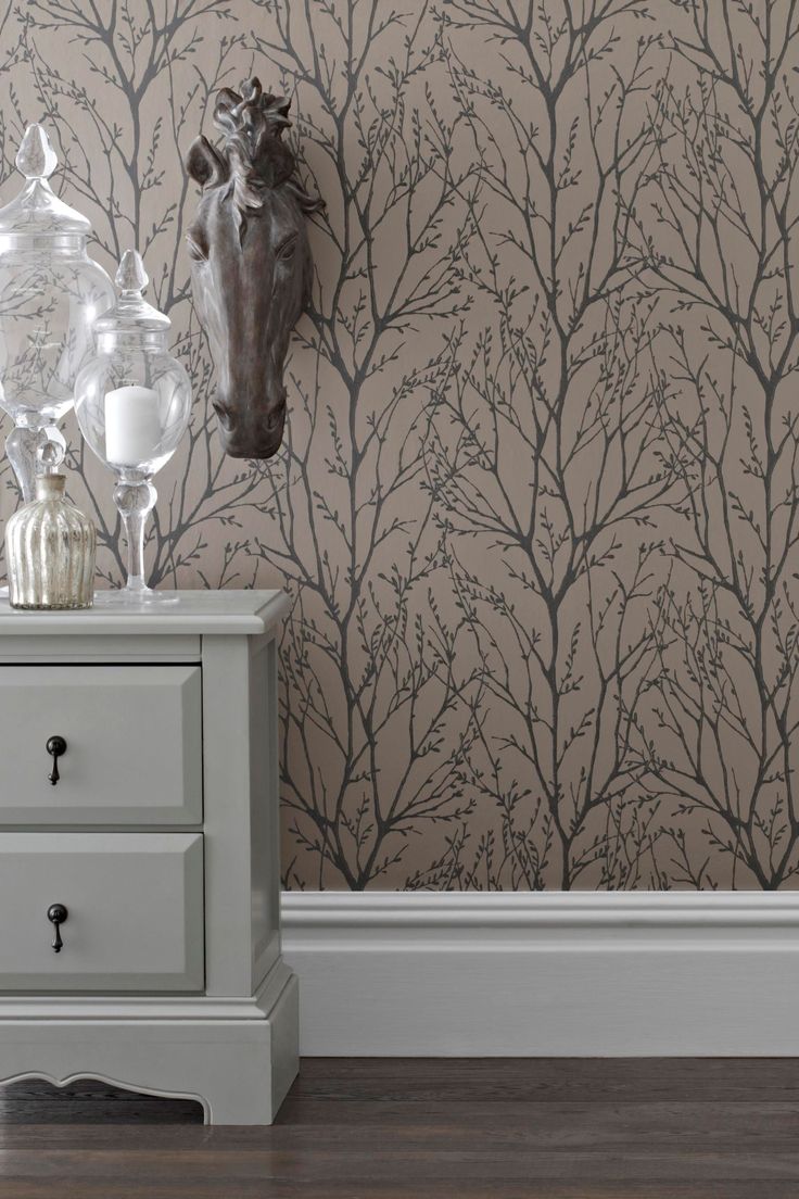 Description: A white dresser with a vase and a vase on top of it next to a wallpapered wall.