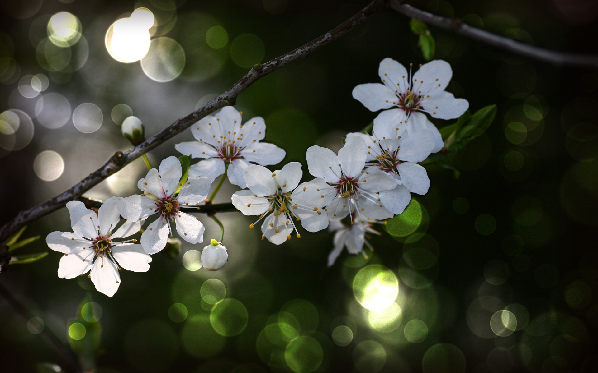 Description: A branch with white flowers on it with a blurry background of boke of light coming through the leaves.