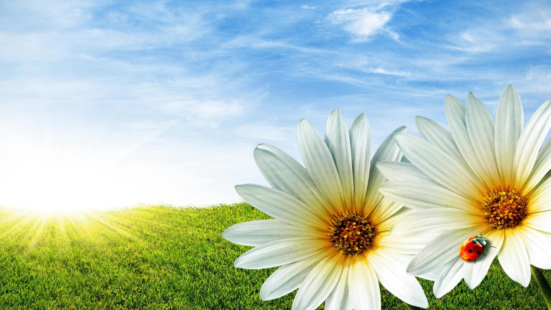 Description: Two white flowers with a lady bug on them in a field of grass with the sun shining behind them.