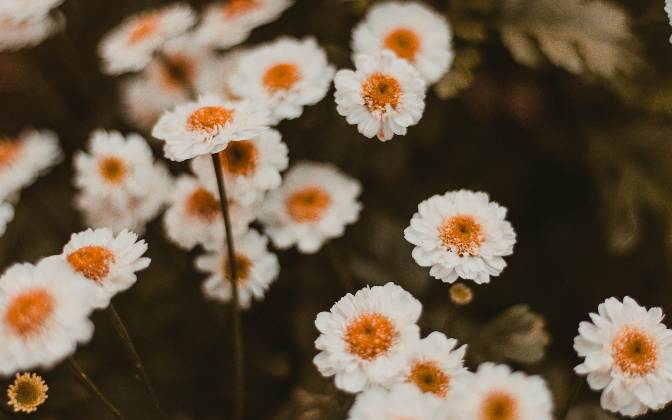 Description: A bunch of white flowers with orange centers in a field of grass and leaves in the background.